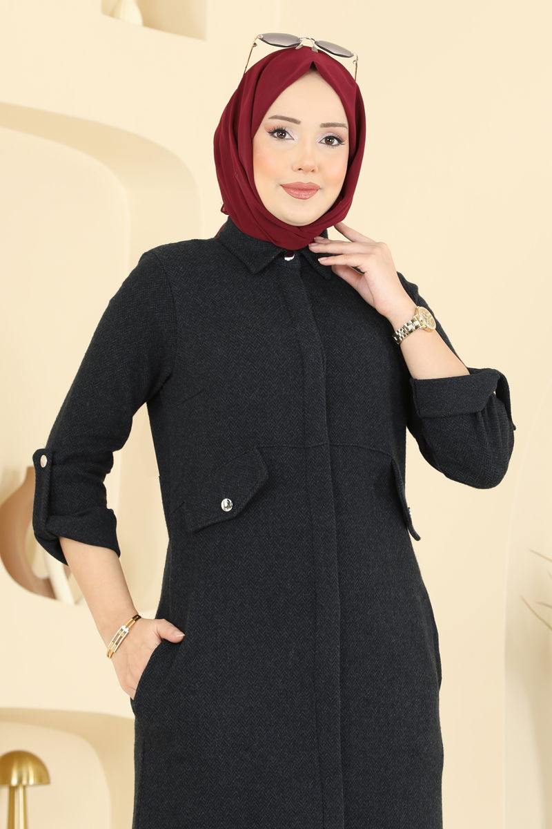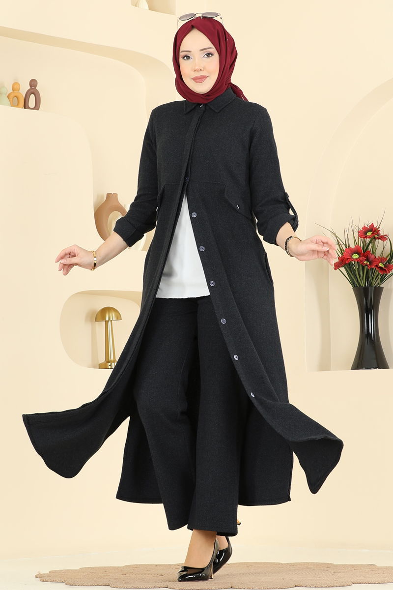 Bu Balıksırtı Siyah Takım, sonbahar ve kış mevsimlerinde ideal bir tesettür giyisidir. Balıksırtı deseniyle üretilmiş, şıklığı ve rahatlığı bir arada sunar. Hafif yapısı, gömlek yaka ve gizli düğmelerle modern bir tasarıma sahiptir. Tunik, yan kesikleri ve gizli ceplerle işlevsellik kazanmıştır, beli dikişlidir ve pantolon lastik belli. Manşetler düğmeli detaylarıyla dikkat çekicidir ve cep aksesuarları tasarımı tamamlar. Hassas yıkama modunda 30 derecede yıkanabilir.
