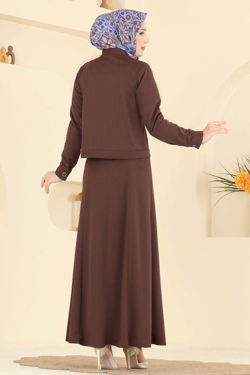 Tesettür Cep Detaylı Elbise ve Ceket Takımı - Kahve