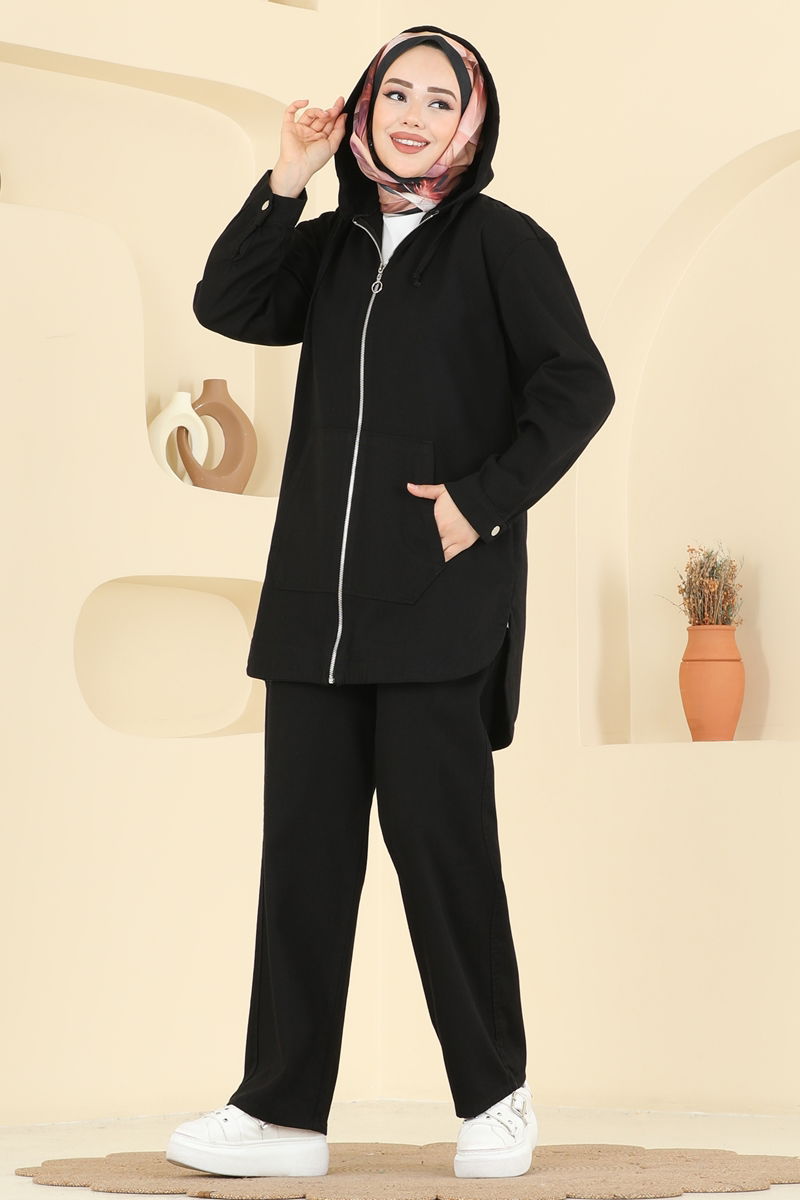 Ürün Detayları: Yeni sezon tesettür giyim ürünü.Ürün kapüşonlu ve fermuar kapamalıdır.Astarsızdır.Kapüşon sabittir.Cepler bulunmaktadır.Pantolon beli elastiktir.Manşet düğmeleri kullanılabilir.Fotoğraflama sırasında renk tonlarında farklılıklar olabilir.