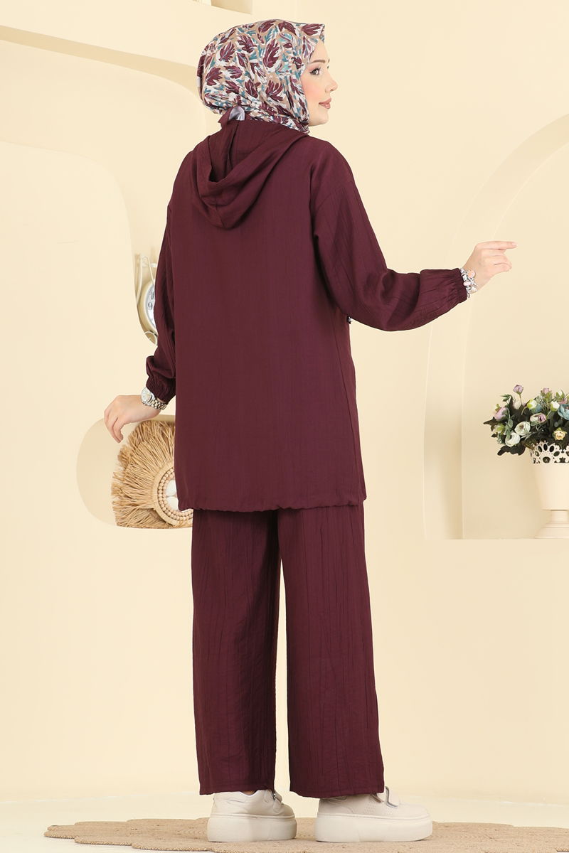 Taş Detaylı Mürdüm Tesettür Takım, yılın her mevsimi için uygundur. 30 derecede yıkanabilme özelliği sunan bu ürün dokuma kumaştan üretilmiş olup, kapşonlu ve fermuarlı yaka tasarımıyla kolay kullanım sağlar. Kapşonu sabit olan üründe yaka ayarlanabilir, taşlar ise yerleştirilmiştir. Elastik pantolon beli ile konfor sunar ve hem hırkada hem de pantolonda cepler bulunmaktadır.