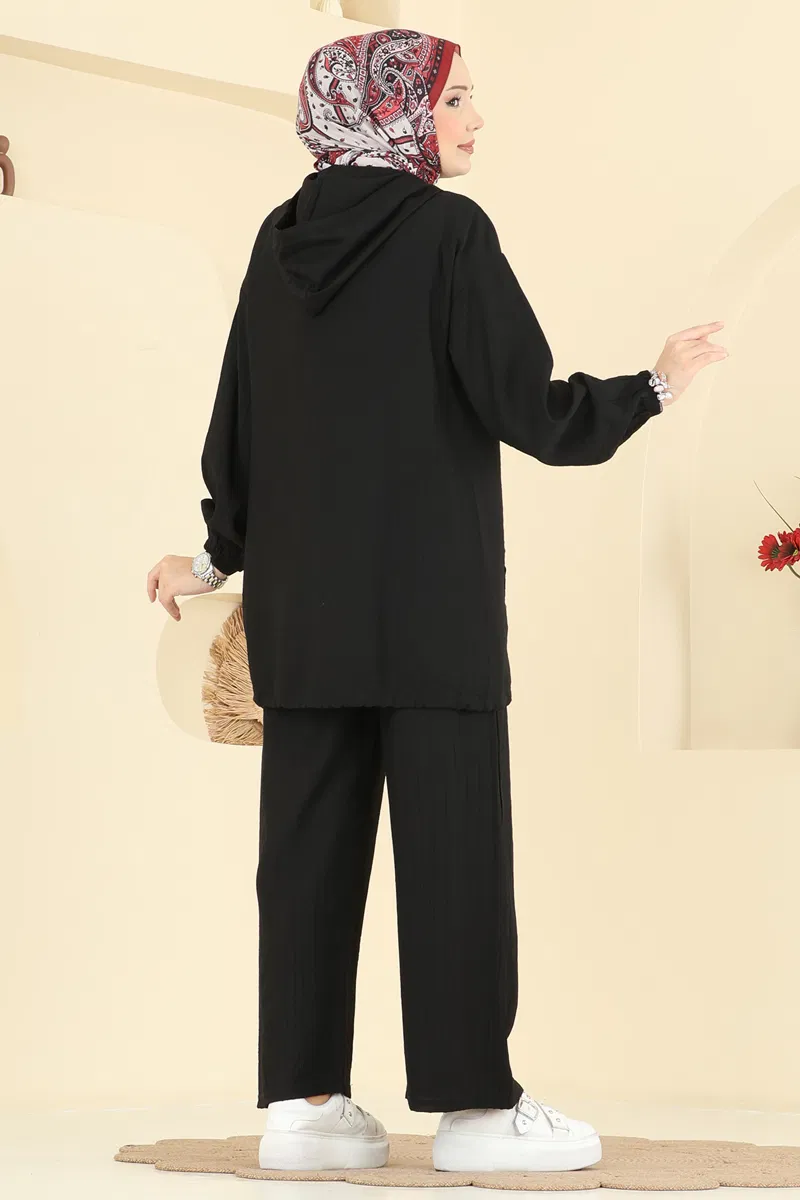 Siyah Taş Detaylı Dokuma Takım, dört mevsim tercih edebileceğiniz bir tesettür giyim ürünüdür. 30 derecede nazikçe yıkanabilir olan bu kıyafet, dokuma kumaş kullanılarak tasarlanmıştır. Kapşon ve ön fermuar özelliği ile kolay kullanım sağlar. Yaka bağcık ayarlanabilir olup, dekoratif taş ayrıntıları göze çarpmaktadır. Kapşon sabitlenmiştir. Pantolon beli esnektir ve üründe hırka ve pantolon cepleri mevcuttur. Model üzerindeki ürün bedeni 38'dir.