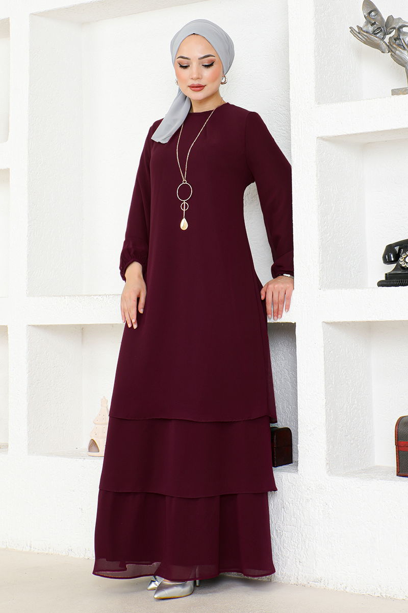 Chiffon Dress BordoKumas Feature: The product is made of chiffon fabric.Product Length : 140 cm. Product Feature: It is a new season product. The product is four seasons old. It is lined. A bicycle is a collar. It has a single active button on the back. The sleeve cuffs are rubberized. The necklace is mobile and is sent with the product. Washing Instructions : Washing should be done at 30 degrees. Mannequin dimensions Size : 1.67 (Without shoes) Chest : 80Bel : 68Basen : 96the product on the man is a size 38.NOTE: The product mold is a one-to-one mold, it is recommended to order your own size. There may be slight tonal differences in product colors due to concept shots.Tags