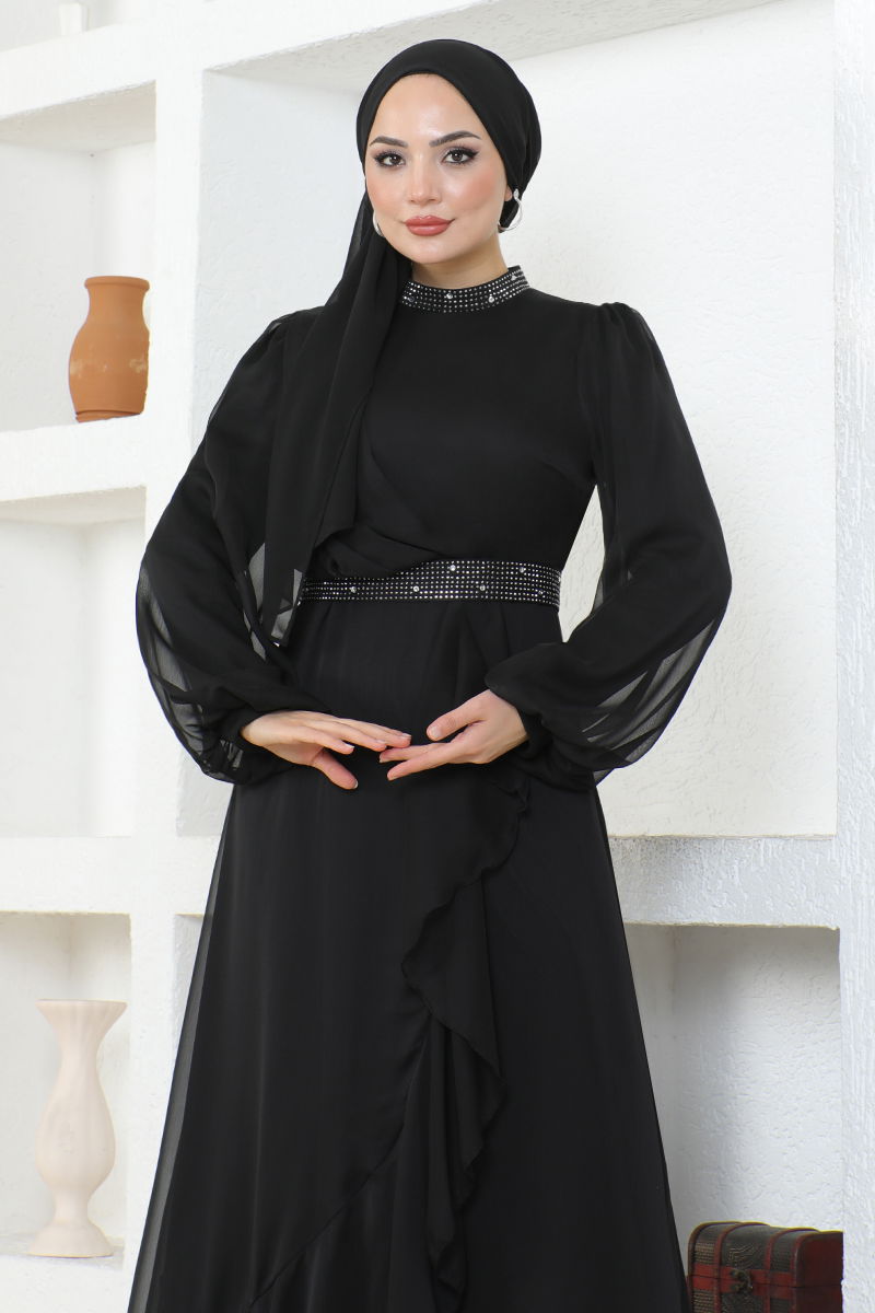 Chiffon Evening Dress SiyahKumas Feature: The product is made of chiffon fabric.Product Length : 140 cm.Product Feature: It is a new season product. The product is four seasons old. It is lined. Catch half a judge. It has a hidden zipper on the back. There is a sticky stone on the neck and belt. The belt is mobile and is supplied with the product.Washing Instructions : Only dry cleaning should be done.Mannequin dimensions Size : 1.67 (Without shoes) Chest : 80Bel : 68Basen : 96the product on the man is a size 38.NOTE: The product mold is a one-to-one mold, it is recommended to order your own size. There may be slight tonal differences in product colors due to concept shots.The exchange time for this product is 24 hours. Since the product is an evening dress product, for exchange, you must send it to us with the cargo you received no later than 24 hours after the product reaches you.Tags