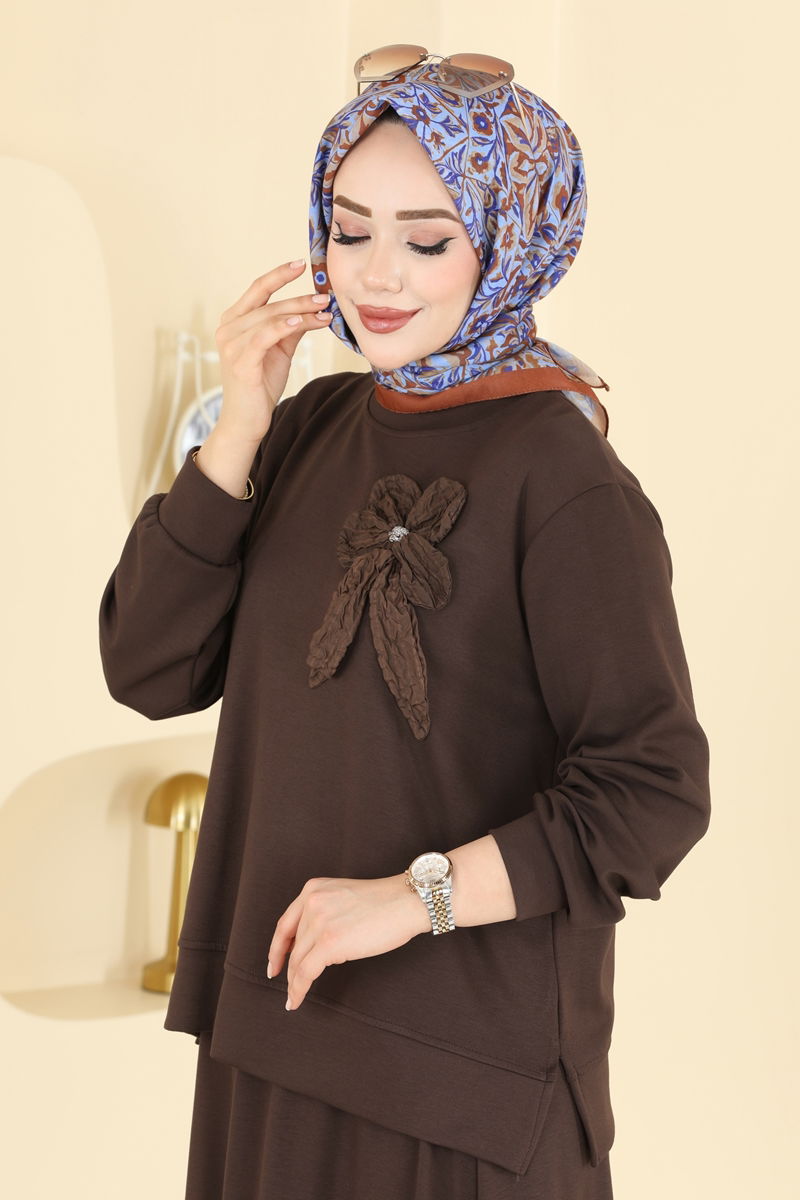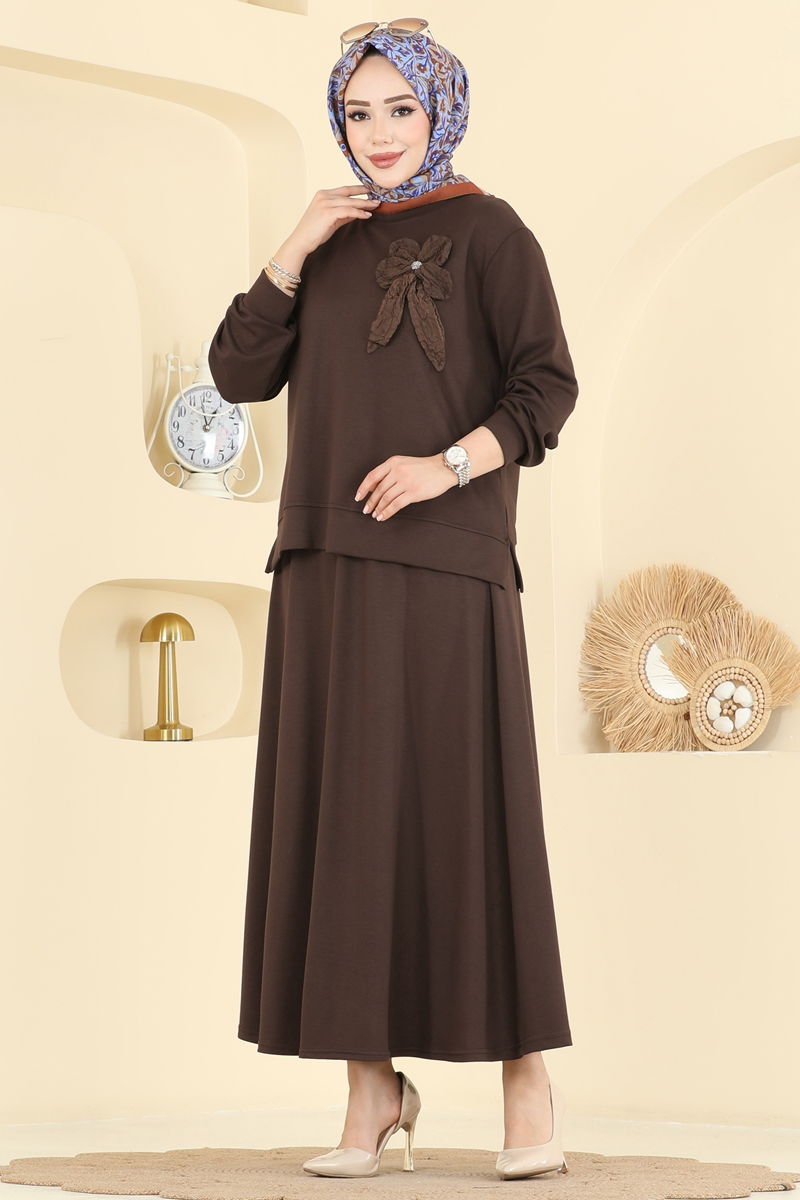 Çiçek Aksesuarlı Etekli Takım 2601TPK1167-MS Kahve
