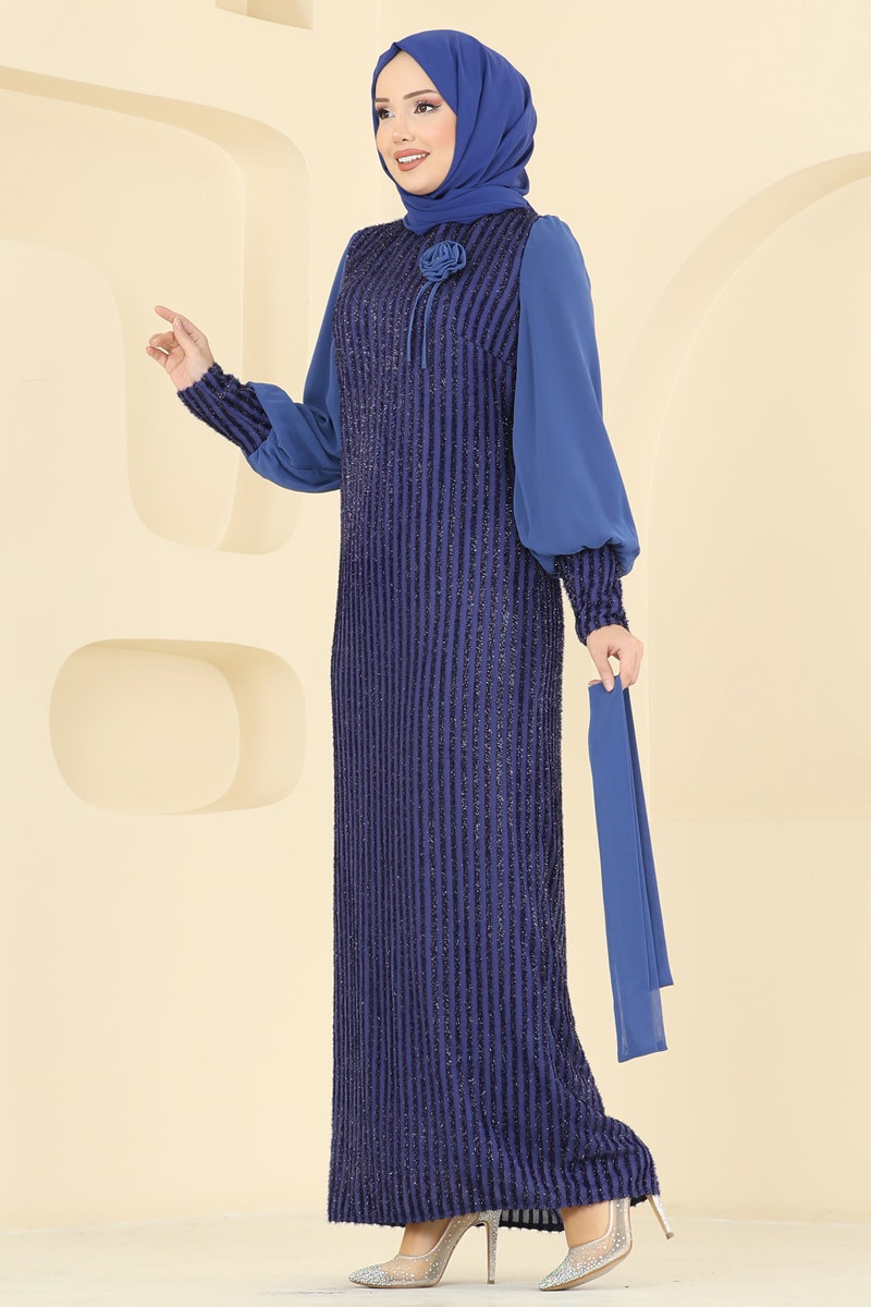Indigo Simli ve Çiçek Detaylı Abiye Elbise