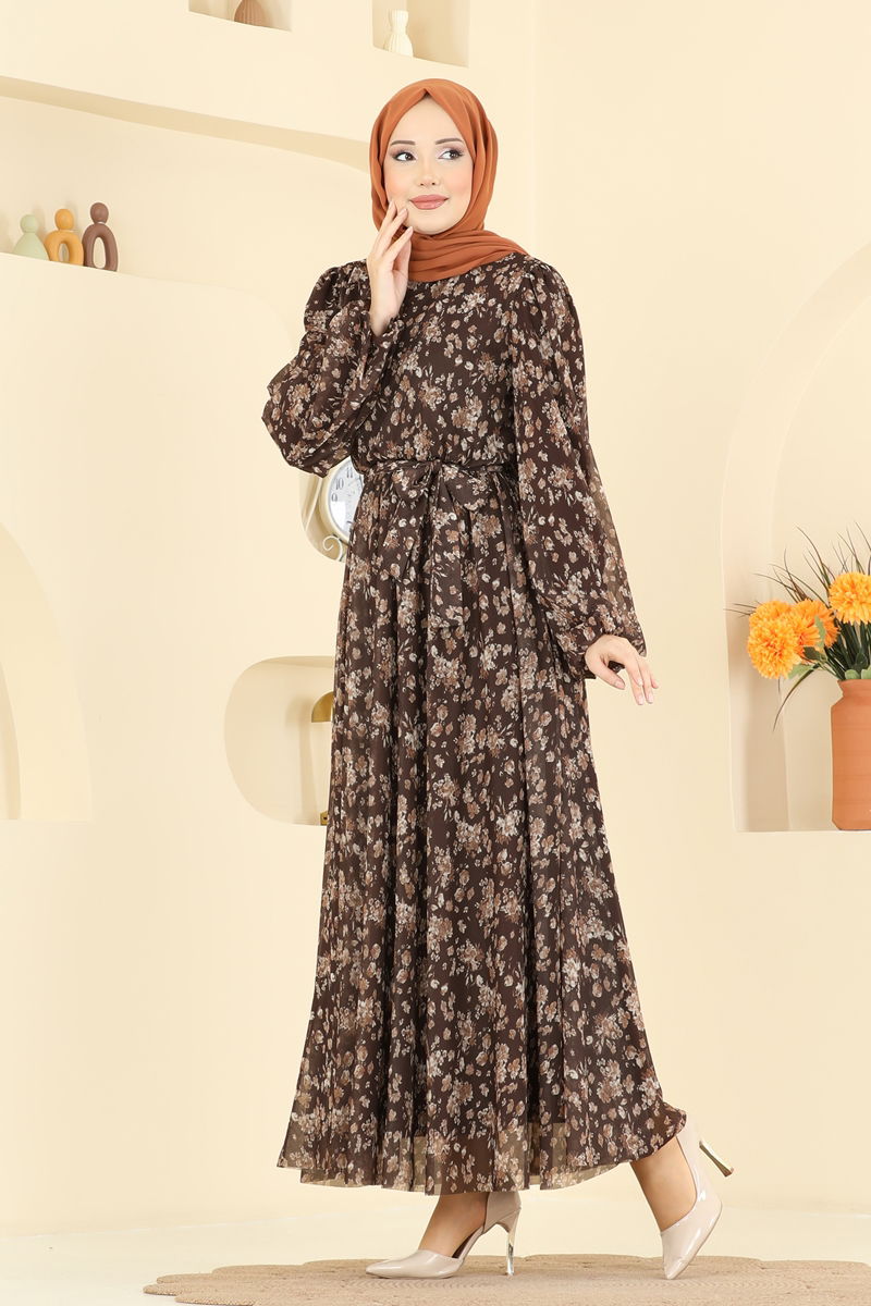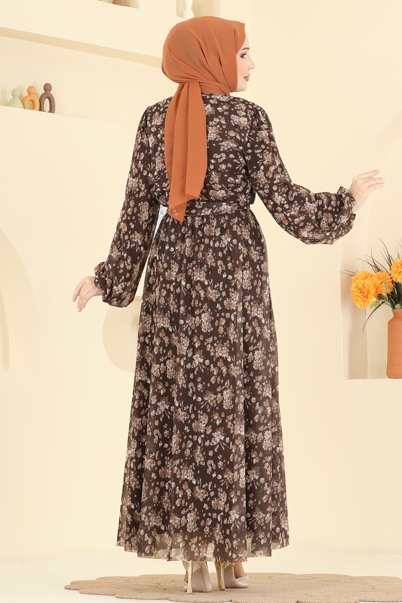 Çiçek Baskılı Tül Elbise 5750EDF311-MS Kahve