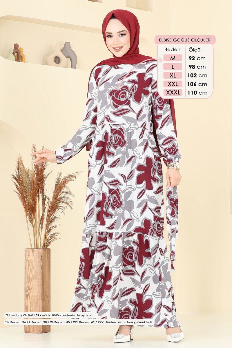 Elegant and comfortable, the Floral Patterned Dress is a Hijab style suitable for all seasons. Made from delicate bouquet fabric, this dress can be washed without wringing at 30 degrees. It features a crew neck and elasticated cuffs, without a lining. The belt, harmonized with the dress, is stitched at both ends to prevent waving, though its use is optional. This dress is exhibited in size M on the model.