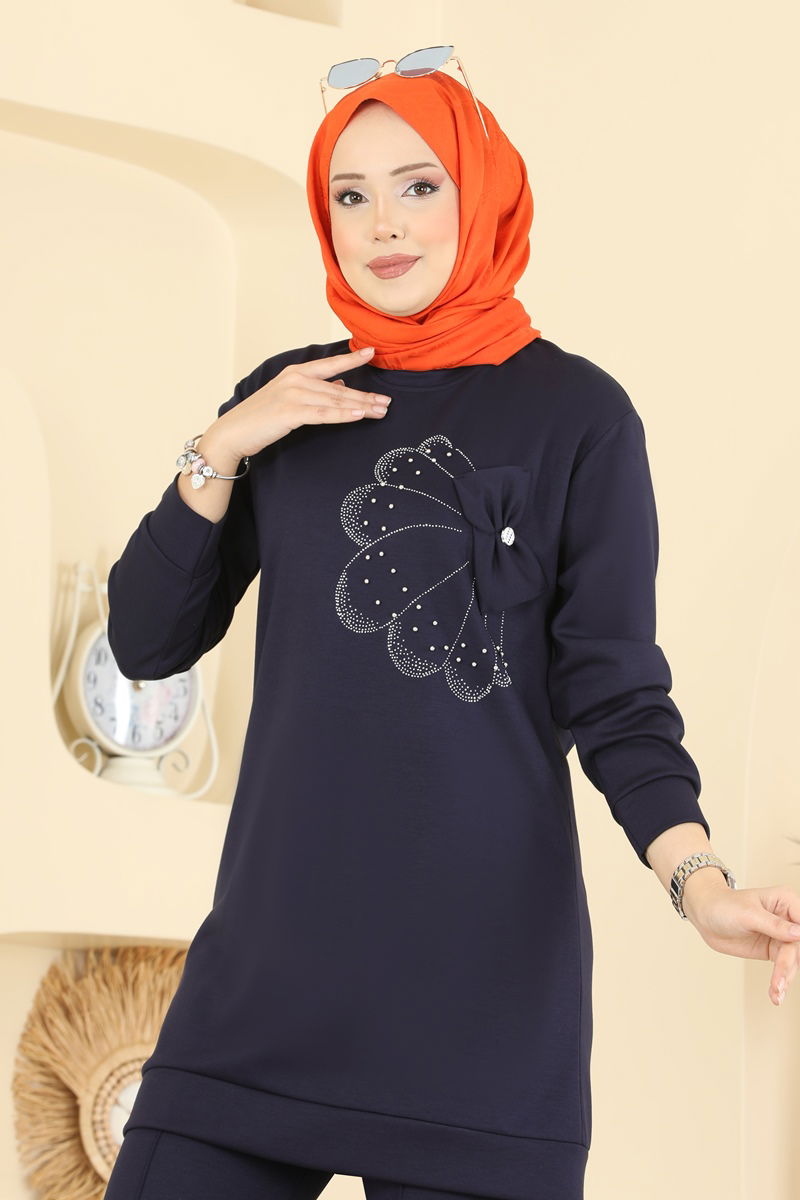 Ürün Özellikleri: Yeni sezon tesettür moda tasarımıdır. Bisiklet yaka tasarımına sahiptir. Astar içermeyen yapısıyla transparan görüntü vermez. Boncuk işleme detayları bulunmaktadır. Pantolon beli lastiklidir.Üründe çekimler nedeniyle renk farklılıkları görülebilir.Model Bilgileri: Boy: 165 cm, Göğüs: 80 cm, Bel: 68 cm, Basen: 96 cm, Ağırlık: 54 kg.