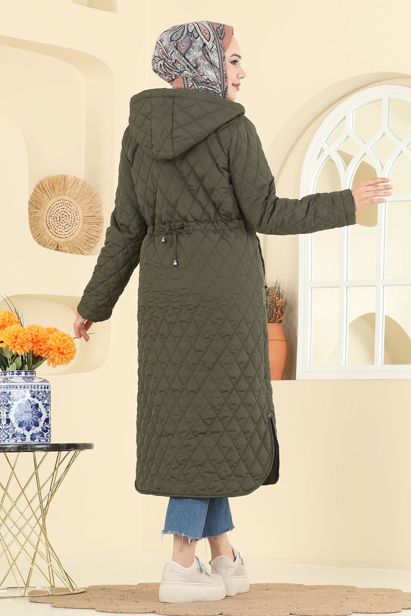 Meet the Hooded Quilted Coat, your go-to garment for the colder autumn and winter seasons. This modesty coat stands out with the comfort and style of quilted fabric. It allows for gentle washing at 30 degrees, ensuring durability and easy maintenance. The hooded design, zippered front, and adjustable tie at the back offer both functionality and a stylish appearance. The slit detail provides freedom of movement, while the lined interior keeps you warm. The size 38 on the model ensures a perfect fit for all sizes. Practical pocket details make everyday use easier.