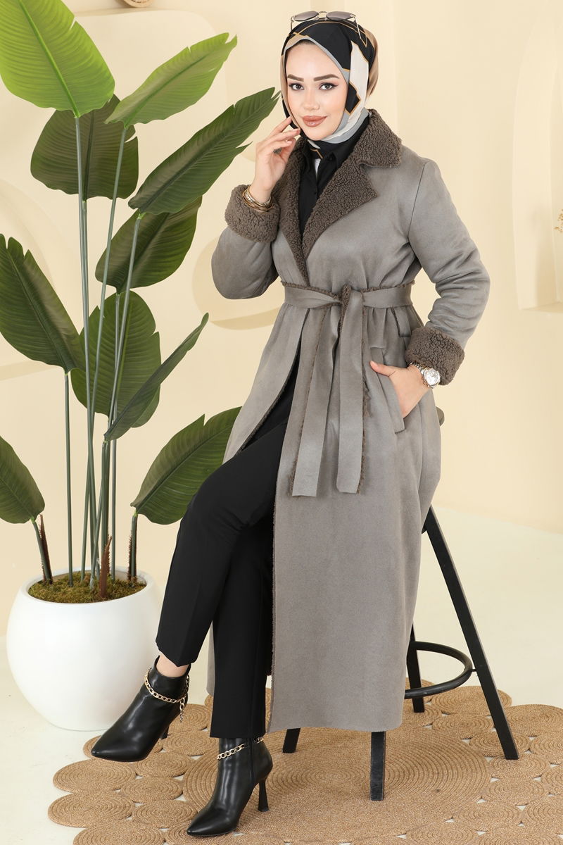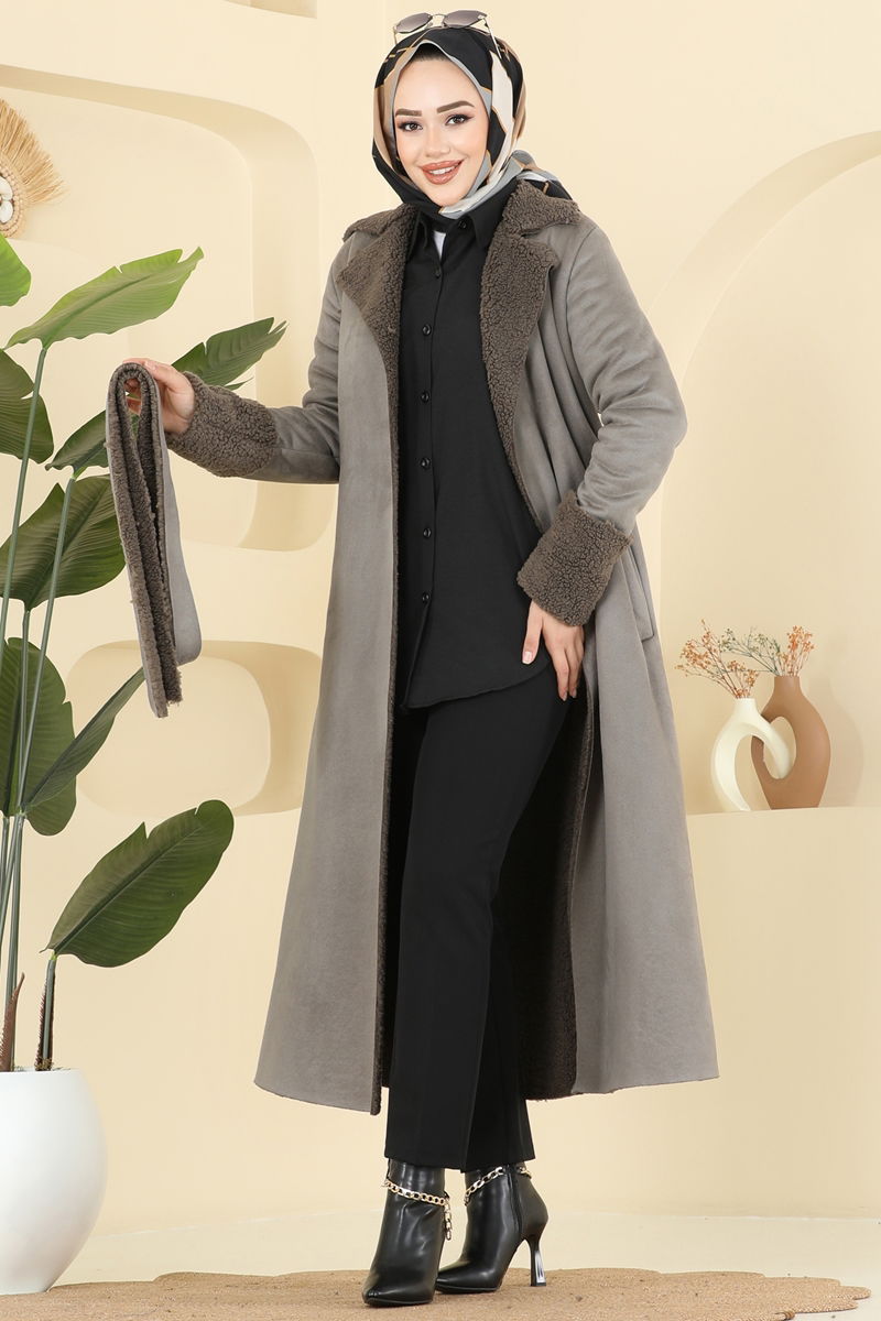 The Suede Coat with Shawl Collar is an ideal modest wear piece to enhance your style during the autumn and winter seasons. This coat, which should only be dry cleaned, is made from a luxurious combination of suede and fur fabrics. Featuring a shawl collar design, it is lined with fur to keep you warm. The coat includes stylistic folded cuff details and an adjustable belt that can be optionally used. It also comes with practical side pockets. This coat, fitting seamlessly into any fashion-forward wardrobe, ensures both comfort and elegance.