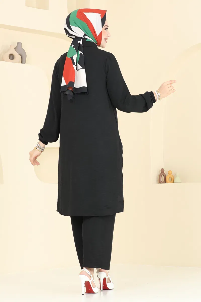 The Buttoned Front Aerobin Suit is a stylish Islamic clothing option suitable for all seasons. It can be washed gently at 30 degrees. Made from aerobin fabric, it offers light and comfortable wear throughout the day. It features a shirt collar and buttoned front for a modern look. The trousers have an elastic waist and cuffed ankles, ensuring a flexible fit. This suit combines elegance and practical comfort for all occasions.