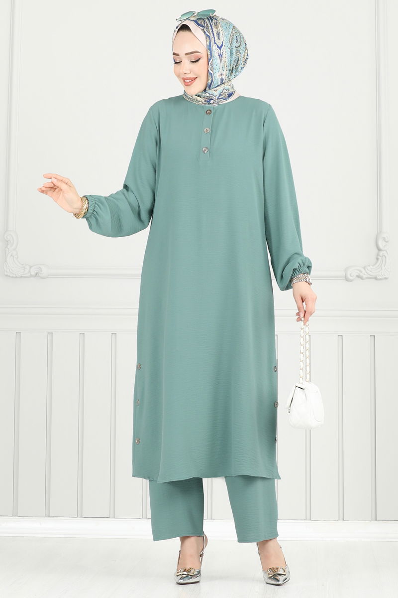 يتم ارتداء المنتج على الرأس. المنتج لديه ياقة دائرية. المنتج به أزرار نصف أمامي. الازرار الموجود بالفتحات اكسسوار. غير مبطنة. خصر البنطال مرن. السوار مطاطي. قد يكون هناك اختلاف في الدرجة اللونية في المنتج بسبب التقاط الصور الفوتوغرافية.