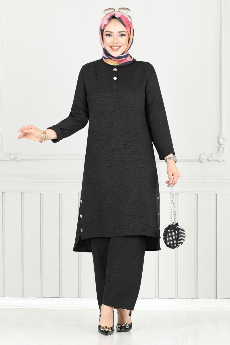 The Half-Buttoned Linen Suit KOMBIN offers unique design and comfort for all seasons. Made from Sofia Linen fabric, this suit can be easily cleaned with a gentle wash at 30 degrees. Its crew neck and half-buttoned front design combine elegance with practical use. The elastic waistband of the trousers ensures comfort throughout the day. This modern and stylish suit prioritizes elegance and comfort in modest fashion.