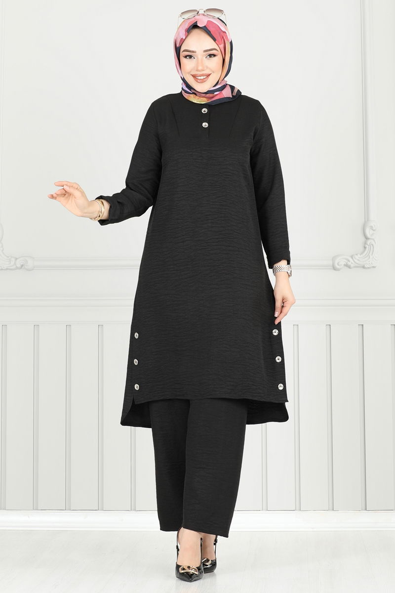 المنتج لديه ياقة نصف بيضوية. المنتج به أزرار نصف أمامي. الازرار الموجود بالفتحات اكسسوار. غير مبطنة. خصر البنطال مرن. قد يكون هناك اختلاف في الدرجة اللونية في المنتج بسبب التقاط الصور الفوتوغرافية.