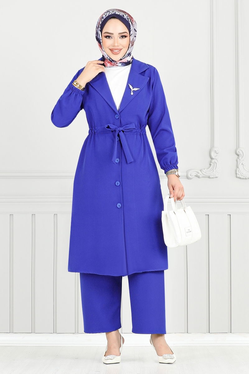 Product Feature : It is a new season hijab fashion product. It has a laced waist. The product has a Double-breasted collar. The product has From the front buttons. It has a slash.. Unlined. The waist of the trousers is elastic. The cuff is rubberized. There may be a tonal difference in the product due to concept photo shoots.