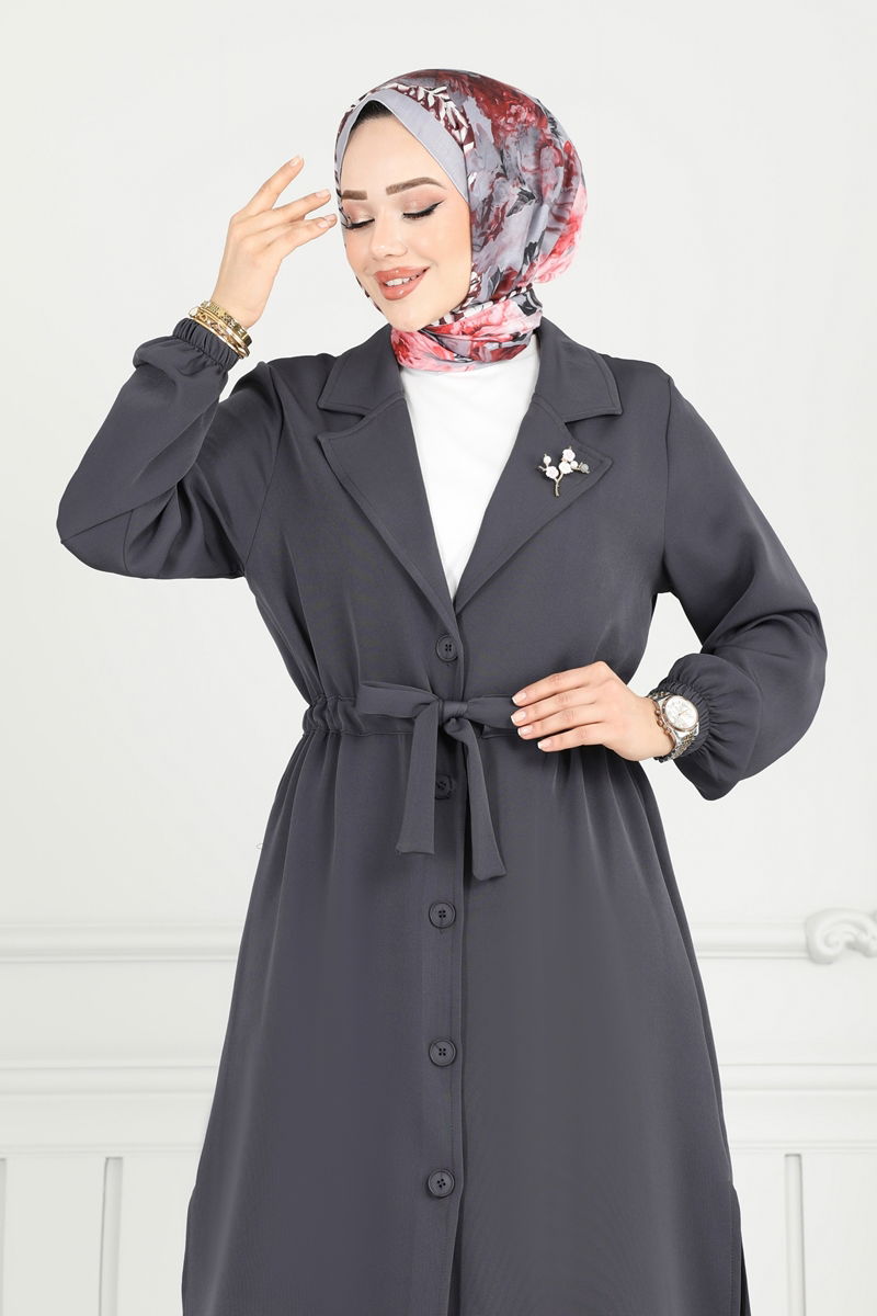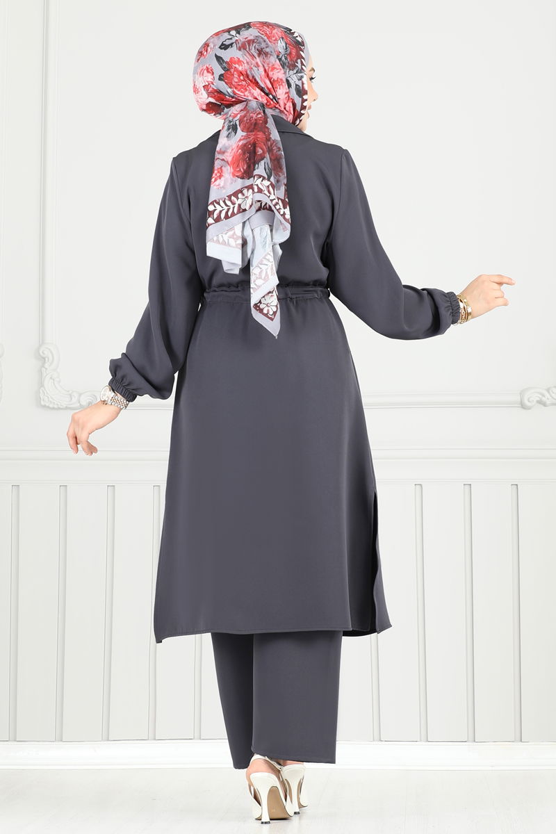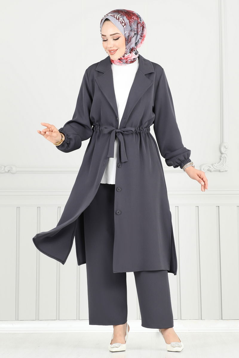 Product Feature : It is a new season hijab fashion product. It has a laced waist. The product has a Double-breasted collar. The product has From the front buttons. It has a slash.. Unlined. Blouse is not included. Sample combination is made with the blouse to show the intended use of the product. Accessories are not included. The waist of the trousers is elastic. The cuff is rubberized. There may be a tonal difference in the product due to concept photo shoots.
