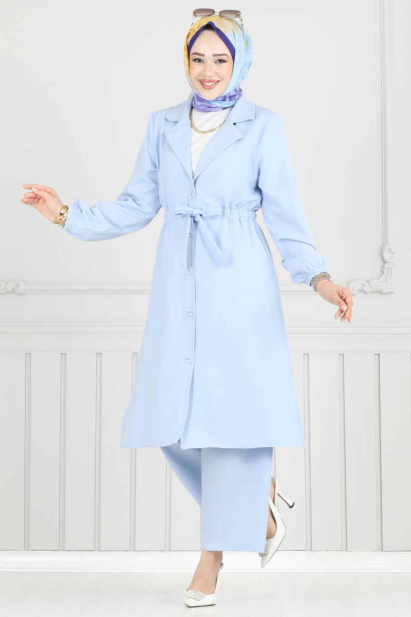 يتميز بخصر ذو أربطة. المنتج لديه ياقة مفتوحة. المنتج به أزرار من الأمام. يحتوي على فتحة. غير مبطنة. البلوزة غير متضمنة. صُنعت عينة من المجموعة مع البلوزة لإظهار الاستخدام المقصود للمنتج. الملحقات غير متضمنة. خصر البنطال مرن. السوار مطاطي. قد يكون هناك اختلاف في الدرجة اللونية في المنتج بسبب التقاط الصور الفوتوغرافية.