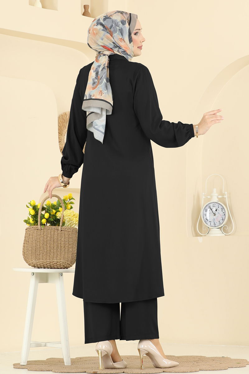 The Belmando Suit model features hidden buttons, making it an eye-catching modest wear item. Suitable for all seasons, this design can be washed delicately at 30 degrees. The shirt-collared, unlined tunic top and elastic-waisted trousers offer both comfort and elegance. Made from special Belmando fabric, this suit ensures a graceful fit. Elastic bands on the tunic and trouser cuffs enhance freedom of movement.