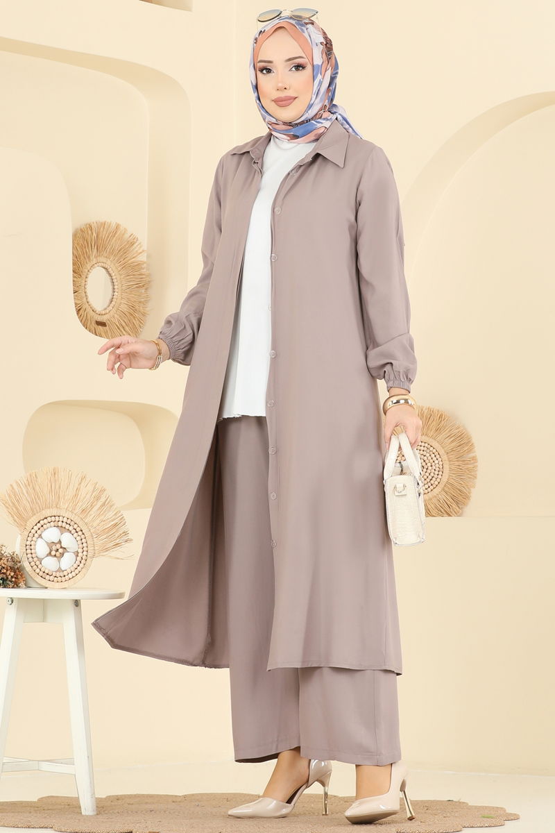 The Belmando Suit model features hidden buttons, making it an eye-catching modest wear item. Suitable for all seasons, this design can be washed delicately at 30 degrees. The shirt-collared, unlined tunic top and elastic-waisted trousers offer both comfort and elegance. Made from special Belmando fabric, this suit ensures a graceful fit. Elastic bands on the tunic and trouser cuffs enhance freedom of movement.