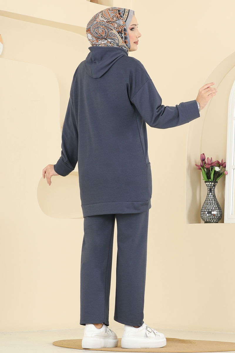 Extremely comfortable and stylish, our Hooded Sport Set is a modest ensemble that can be worn in all four seasons. Made from dual yarn fabric, this set is both high-quality and durable. Comprising a tunic and pants, it can be washed gently at 30 degrees and is easy to maintain. The product features a hooded neckline and is unlined. The product size displayed on the model is 38, indicating a flexible fit that can accommodate various body types.