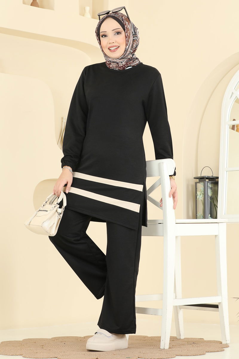 The Garni Detailed Two Thread Suit is a stylish and comfortable Islamic wear set. It can be used comfortably across all four seasons. Offers delicate washing at 30 degrees. Featuring a modern bike neckline, the tunic with side slits and elastic-waisted pants are both stylish and practical. The cuffs are elasticated, and it is unlined. The product on the model is size 38, making it an ideal choice.
