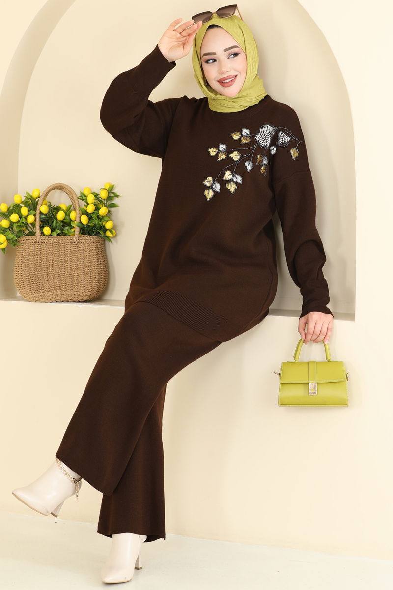 The Embroidered Sequin Knit Set, model, offers elegance and comfort together in modest fashion. Suitable for Autumn and Winter, this set features a washable at gentle 30 degrees. The warm and breathable knit fabric provides comfort all day long. With its crew neck and unlined design, it presents a modern look. The tunic and pants are meticulously embroidered with sequins and beads, while the elastic waist of the pants offers maximum comfort.