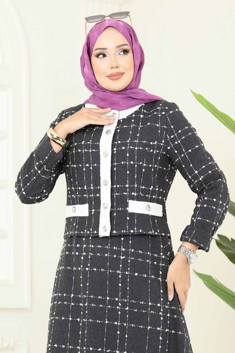 Jacketed Tweed Two-Piece model modest clothing item. It can be used in Autumn and Winter season. It should be washed at 30 degrees without squeezing. It is made of first class Tweed fabric. The product has a Bicycle collar. The product is buttoned from the front. It is unlined. The product has a zip at the waist. (The product on the model is size 38.) There are usable buttons at the front. The waist of the skirt has a zip from the back.