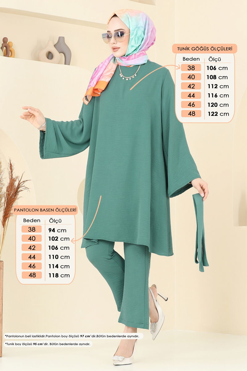 The Belted Aerobin Set combines elegance and comfort in modest clothing. Suitable for all seasons, this model is made from special Aerobin fabric, which is light and breathable. The product is suitable for delicate wash and can be washed at 30 degrees. Featuring a bike collar and unlined design, the set includes both a tunic and pants, with an elasticated waist for comfortable wear. The belt is stitched at the ends to prevent waving and can be removed optionally. The Belted Aerobin Set, ideal for both everyday and special occasions, lets you express your style.Tunic SIZE DIMENSIONS (CM)Size Chest Length 38 106 95 40 108 95 42 112 95 44 116 95 46 120 95 48 122 95 Pants SIZE DIMENSIONS (CM)Size Waist Hip Length 38 66 94 97 40 68 102 97 42 72 106 97 44 76 110 97 46 80 114 97 48 88 118 97 Weight (Kg):0.61 -