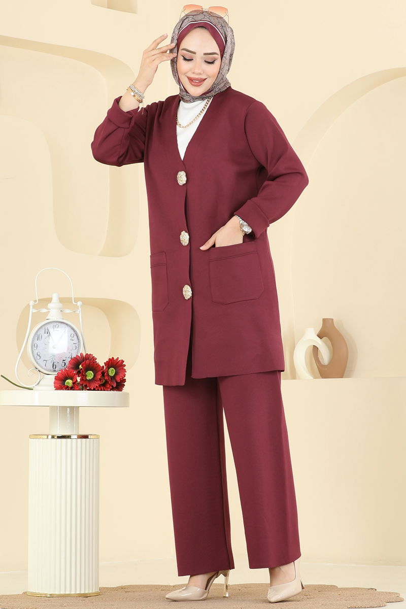 The Button-Detailed Mercerized Suit is a stylish and comfortable choice, specially designed for modest wear. Ideal for autumn and winter, this suit can be washed at 30 degrees on a gentle cycle. Made from mercerized knitted fabric, it offers long-lasting wear. Featuring a V-neck design, this ensemble modernizes your look with button details at the front, is unlined, and opaque. The standard-sized model features an elastic waistband on the pants for comfort. The cardigan and pants design accommodates sizes 36-38-40 and includes pockets.