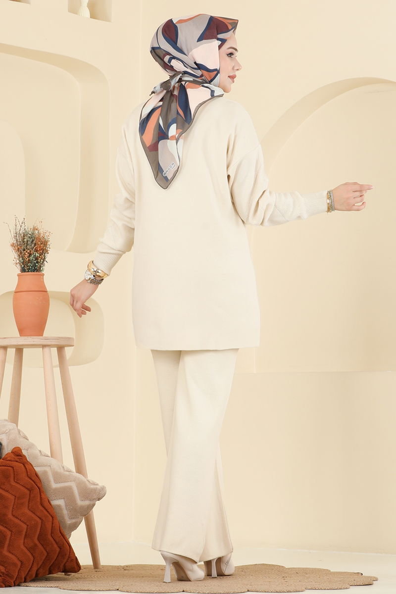 The Button Detailed Knit Set combines elegance and comfort, specially designed for modest wear and suitable for use in autumn and winter. This set, which can be washed with a delicate wash program at 30 degrees, is made from durable knit fabric. With a V-neck design and buttons at the front, it offers a modern look, while its unlined structure ensures comfortable wear. The cardigan and pants with an elastic waist presented in standard sizes add a practical touch to its comfort.