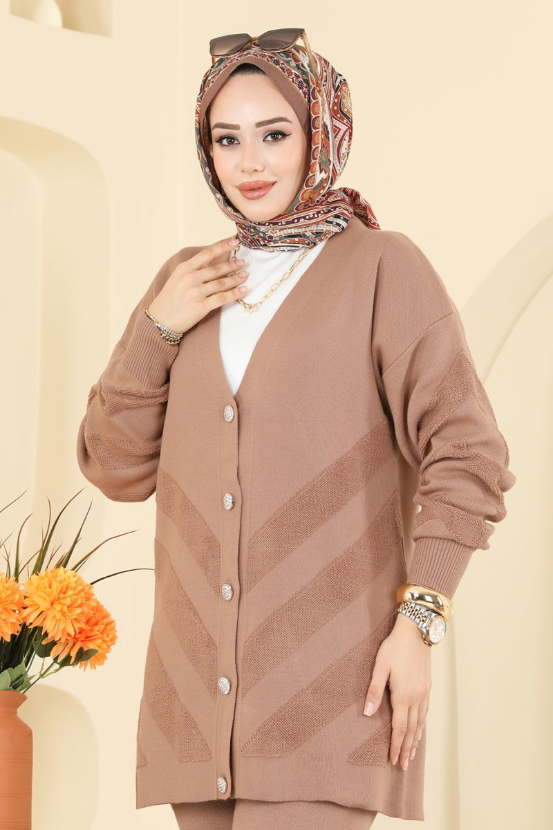 The Button Detailed Knit Set combines elegance and comfort, specially designed for modest wear and suitable for use in autumn and winter. This set, which can be washed with a delicate wash program at 30 degrees, is made from durable knit fabric. With a V-neck design and buttons at the front, it offers a modern look, while its unlined structure ensures comfortable wear. The cardigan and pants with an elastic waist presented in standard sizes add a practical touch to its comfort.