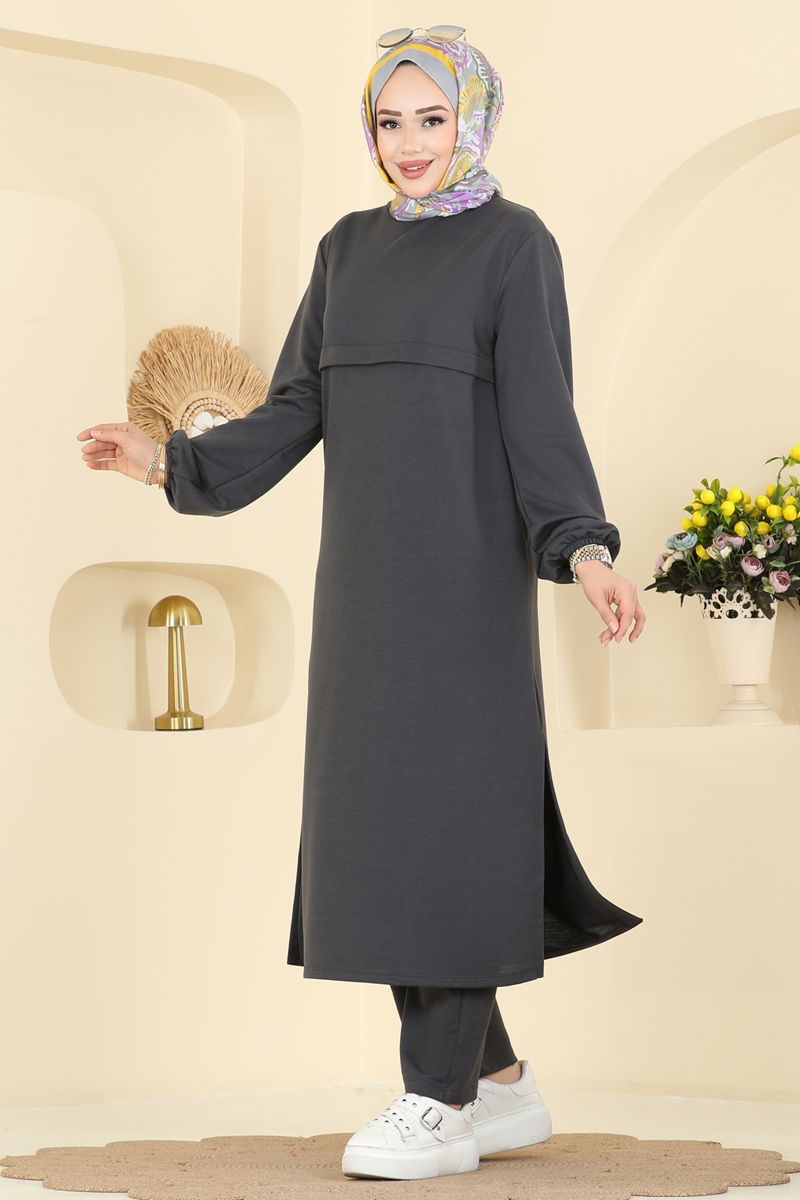 The Elastic Cuff Two Thread Suit is specially designed for modest wear and can be comfortably used in all four seasons. It offers washing at 30 degrees recommended for delicate garments. The product gains a modern look with its bicycle collar, while side slits add dynamism to the tunic. This unlined suit offers comfortable wear. The pants feature an elastic waist, and both tunic and pants cuffs are highly functional. The product worn by the model is size 38.