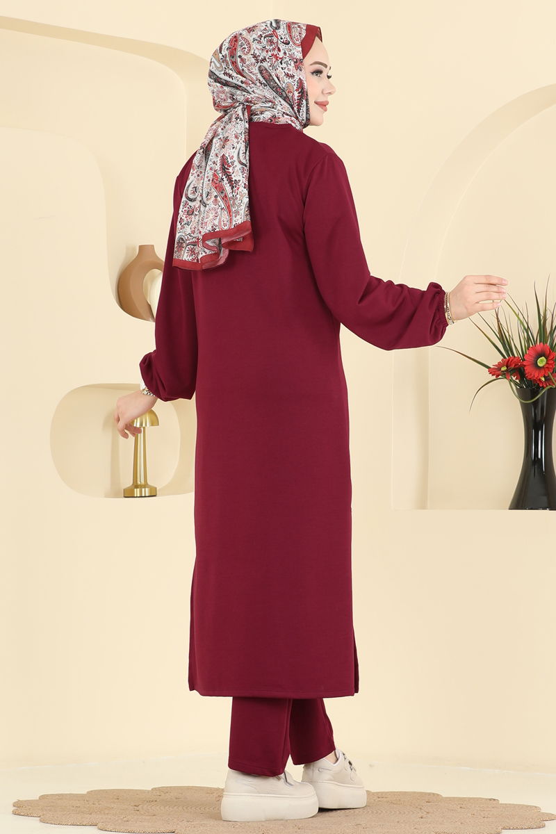 The Elastic Cuff Two Thread Suit is specially designed for modest wear and can be comfortably used in all four seasons. It offers washing at 30 degrees recommended for delicate garments. The product gains a modern look with its bicycle collar, while side slits add dynamism to the tunic. This unlined suit offers comfortable wear. The pants feature an elastic waist, and both tunic and pants cuffs are highly functional. The product worn by the model is size 38.