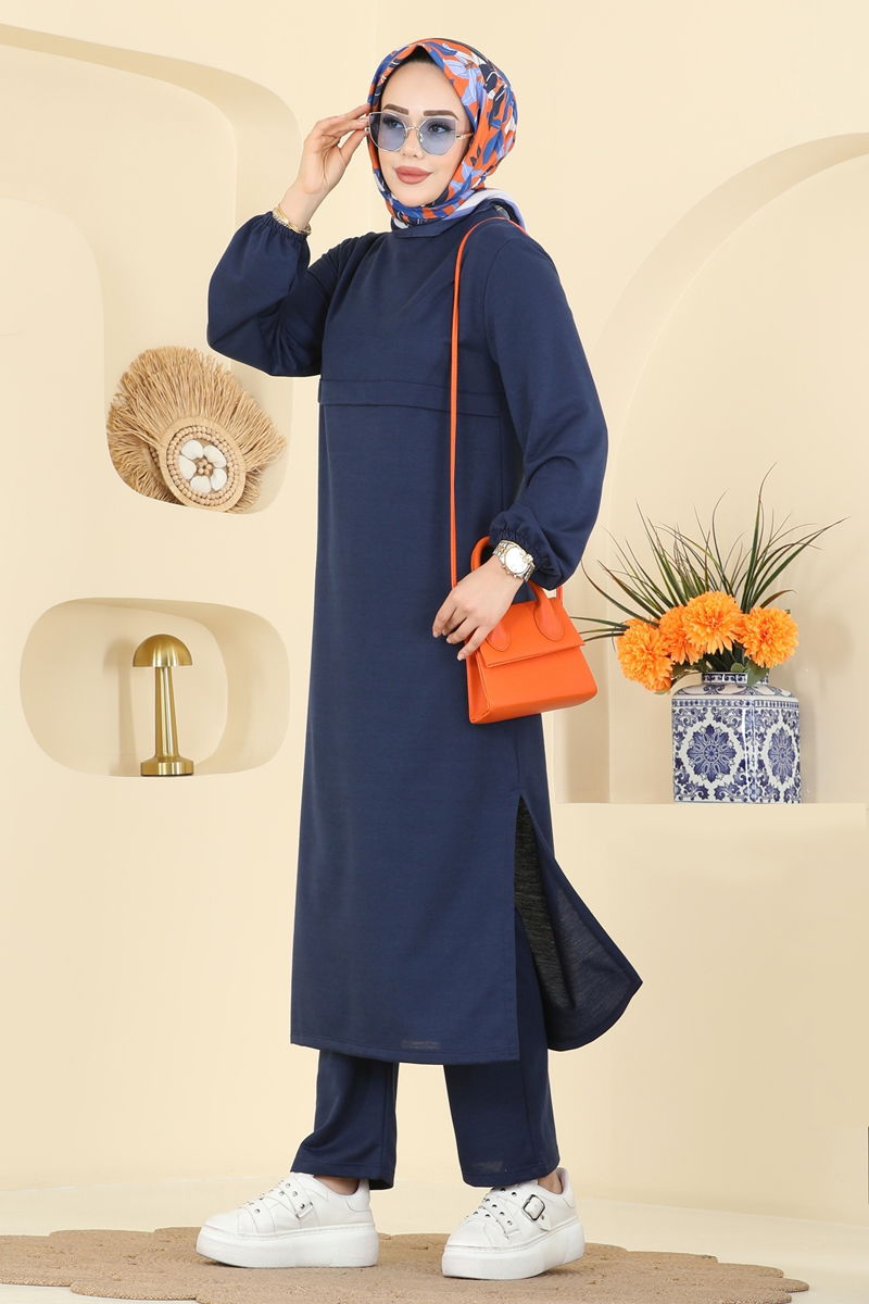 The Elastic Cuff Two Thread Suit is specially designed for modest wear and can be comfortably used in all four seasons. It offers washing at 30 degrees recommended for delicate garments. The product gains a modern look with its bicycle collar, while side slits add dynamism to the tunic. This unlined suit offers comfortable wear. The pants feature an elastic waist, and both tunic and pants cuffs are highly functional. The product worn by the model is size 38.