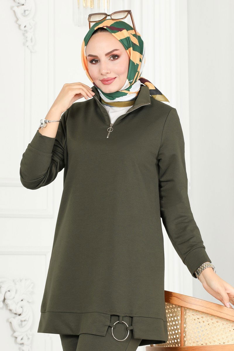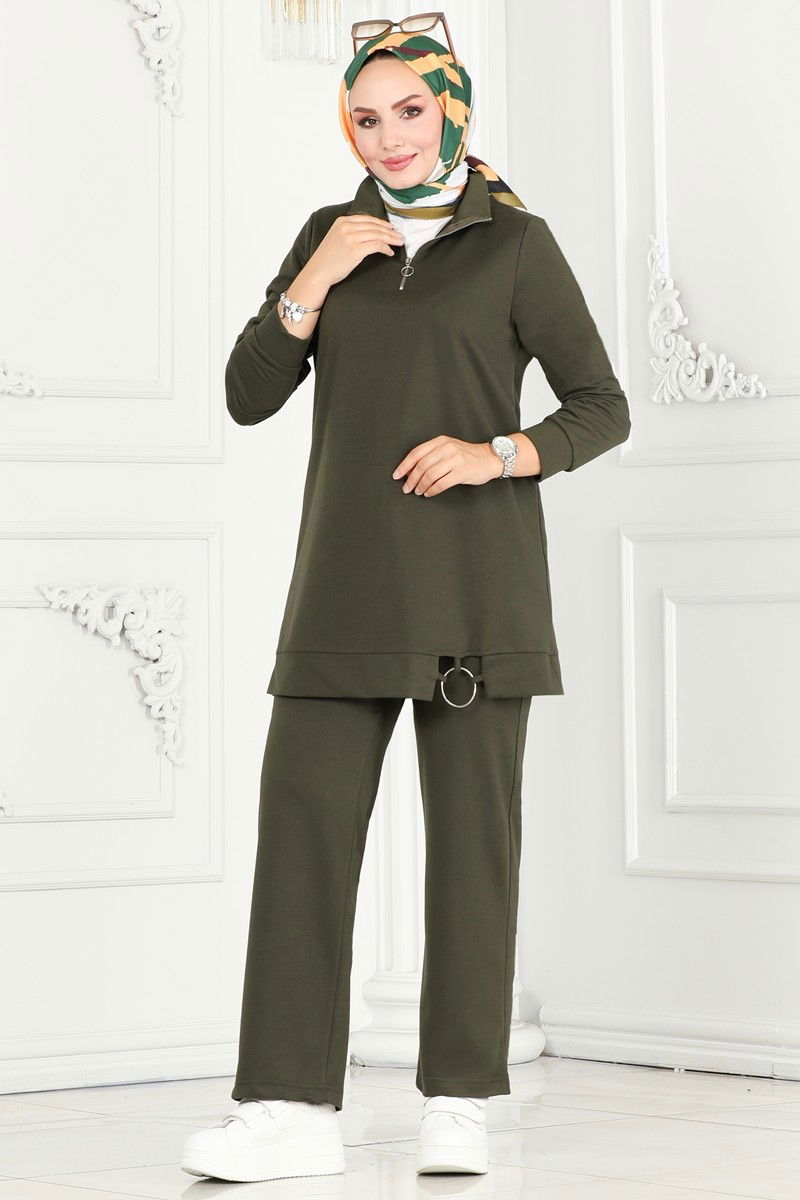 Product Feature : It is a new season hijab fashion product. There is a half zipper that can be used from the front. The product has a Judge collar. Unlined.. The product has a zipper at the From the front part. Metal anti-tarnish accessory. The waist of the trousers is elastic. There may be a tonal difference in the product due to concept photo shoots.