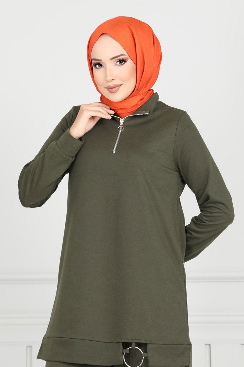 Product Feature : It is a new season hijab fashion product. There is a half zipper that can be used from the front. The product has a Judge collar. Unlined.. The product has a zipper at the From the front part. Metal anti-tarnish accessory. The waist of the trousers is elastic. There may be a tonal difference in the product due to concept photo shoots.