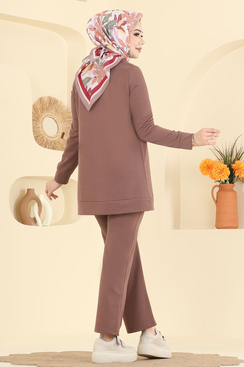 Half-Zip Sports Suit model is a hijab product. It can be used in all seasons. It should be washed at 30 degrees without squeezing. It is made of first-class Two-Thread fabric. The product has a dominant collar. It is unlined. The product has a front zip. (The product on the model is size 38.) It has a usable half-zip in the front. Metal non-tarnishing accessory. The pants have an elastic waist.