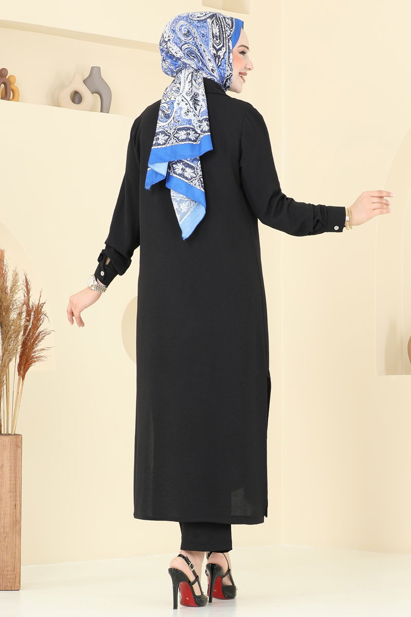 The Side Slit Aerobin Suit, tailored for the modest fashion style with the model, offers comfort in all seasons. This suit, which can be delicately washed and is suitable for washing at 30 degrees, is made from aerobin fabric. With hidden button details and slit button accessories, it enhances elegance while the elastic waistband on the pants increases comfort. Its unlined structure and active cuff buttons make it both stylish and practical.