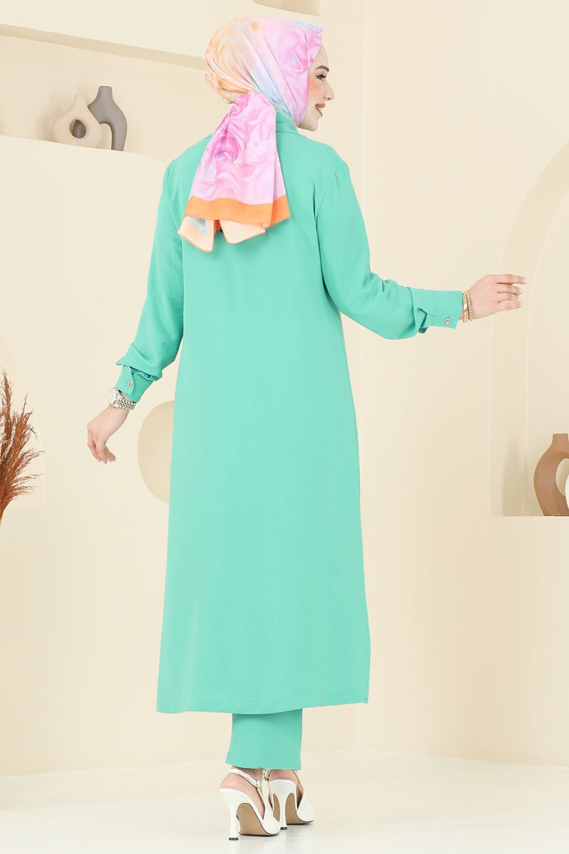 المنتج لديه ياقة القميص. المنتج به أزرار جيزلي. الازرار الموجود بالفتحات اكسسوار. غير مبطنة. الأزرار هي إكسسوارات. البلوزة غير متضمنة. صُنعت عينة من المجموعة مع البلوزة لإظهار الاستخدام المقصود للمنتج. الجيب متاح. خصر البنطال مرن. أزرار الكفة نشطة. قد يكون هناك اختلاف في الدرجة اللونية في المنتج بسبب التقاط الصور الفوتوغرافية.