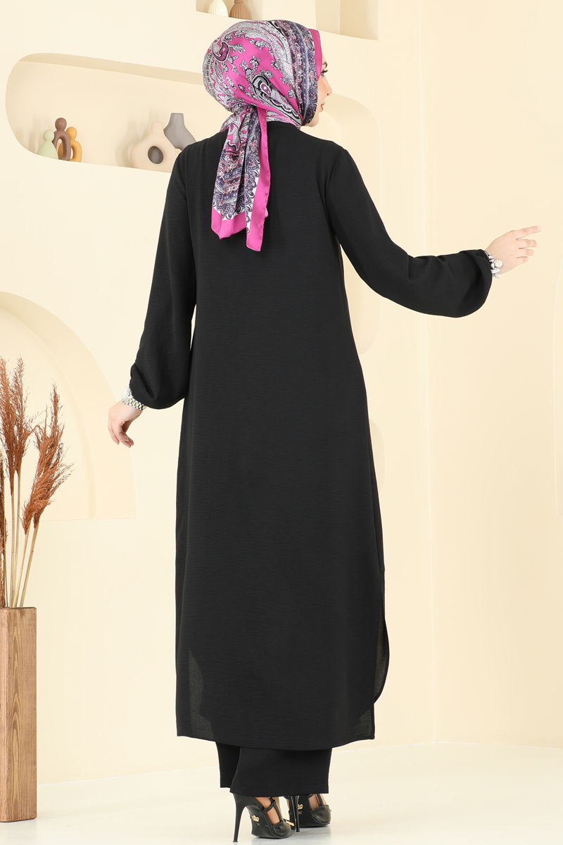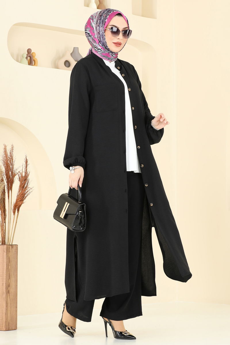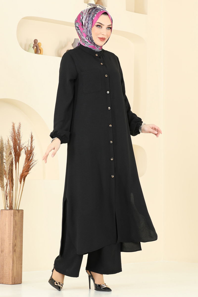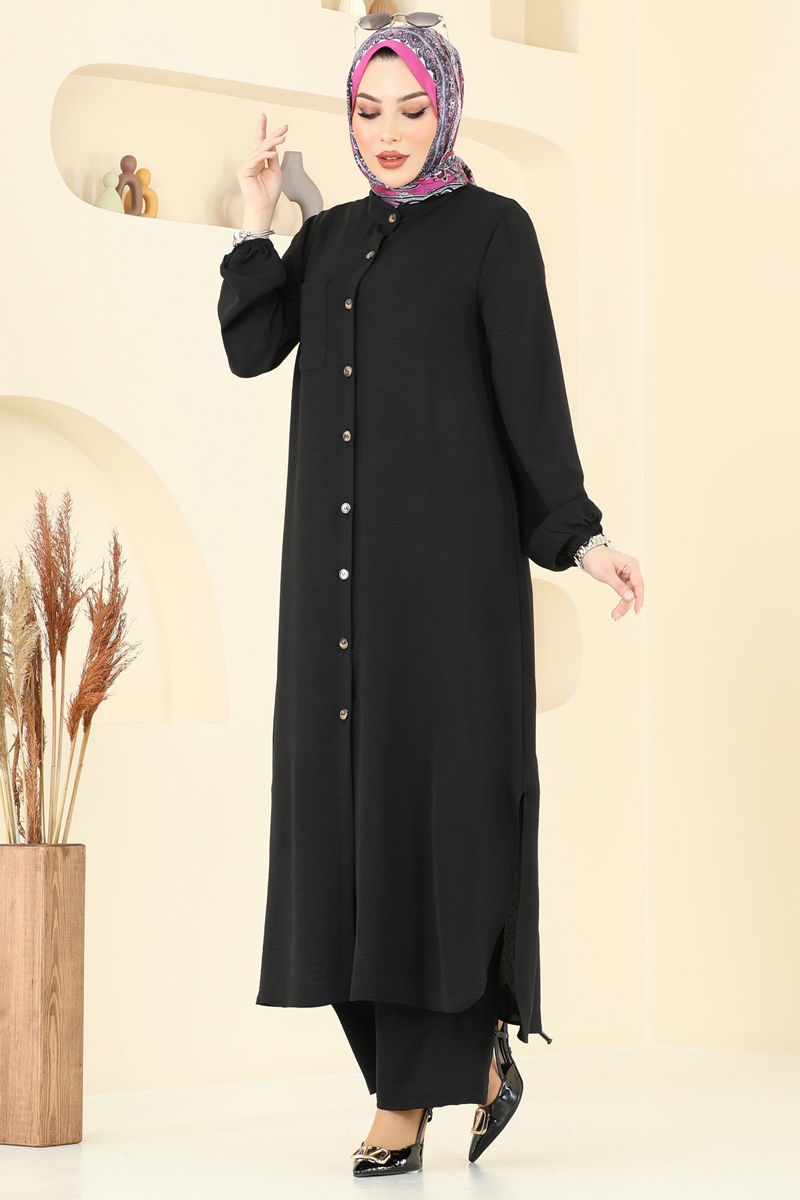 This Chest Pocket Detailed Modest Outfit is perfect for any season, made from aerobin fabric for utmost comfort. Suitable for gentle wash at 30 degrees, this garment features a semi-high collar and front-button design, merging elegance with ease. The side-slitted, lining-free tunic and stretchable waist pants with elastic cuffs ensure mobility and style. The active chest pocket in the tunic adds functionality. Exude grace and comfort with this exquisite modest outfit. (Product shown is a size 38.)