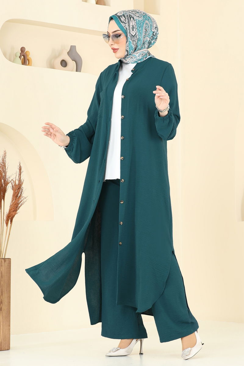 This Chest Pocket Detailed Modest Outfit is perfect for any season, made from aerobin fabric for utmost comfort. Suitable for gentle wash at 30 degrees, this garment features a semi-high collar and front-button design, merging elegance with ease. The side-slitted, lining-free tunic and stretchable waist pants with elastic cuffs ensure mobility and style. The active chest pocket in the tunic adds functionality. Exude grace and comfort with this exquisite modest outfit. (Product shown is a size 38.)