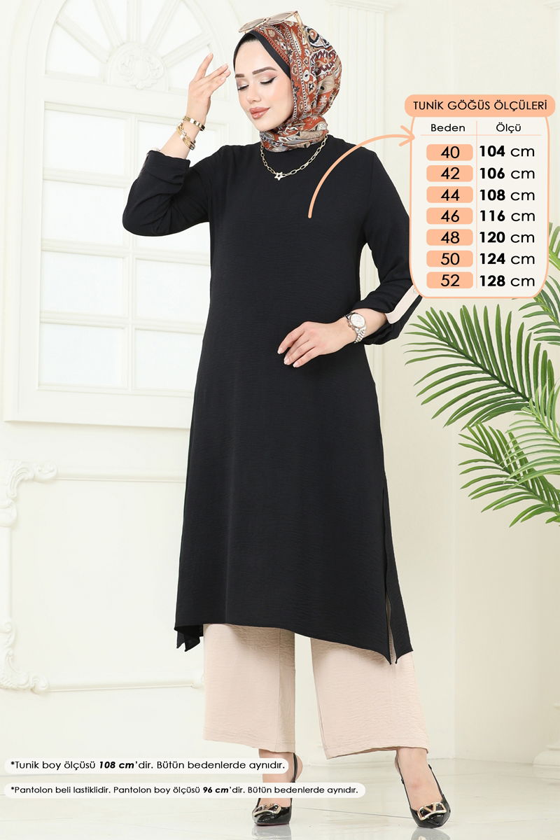 يتم ارتداء المنتج على الرأس. المنتج لديه ياقة دائرية. البلوز تحتوي على فتحة. غير مبطنة. الملحقات غير متضمنة. خصر البنطال مرن. أزرار الكفة نشطة. قد يكون هناك اختلاف في الدرجة اللونية في المنتج بسبب التقاط الصور الفوتوغرافية.
