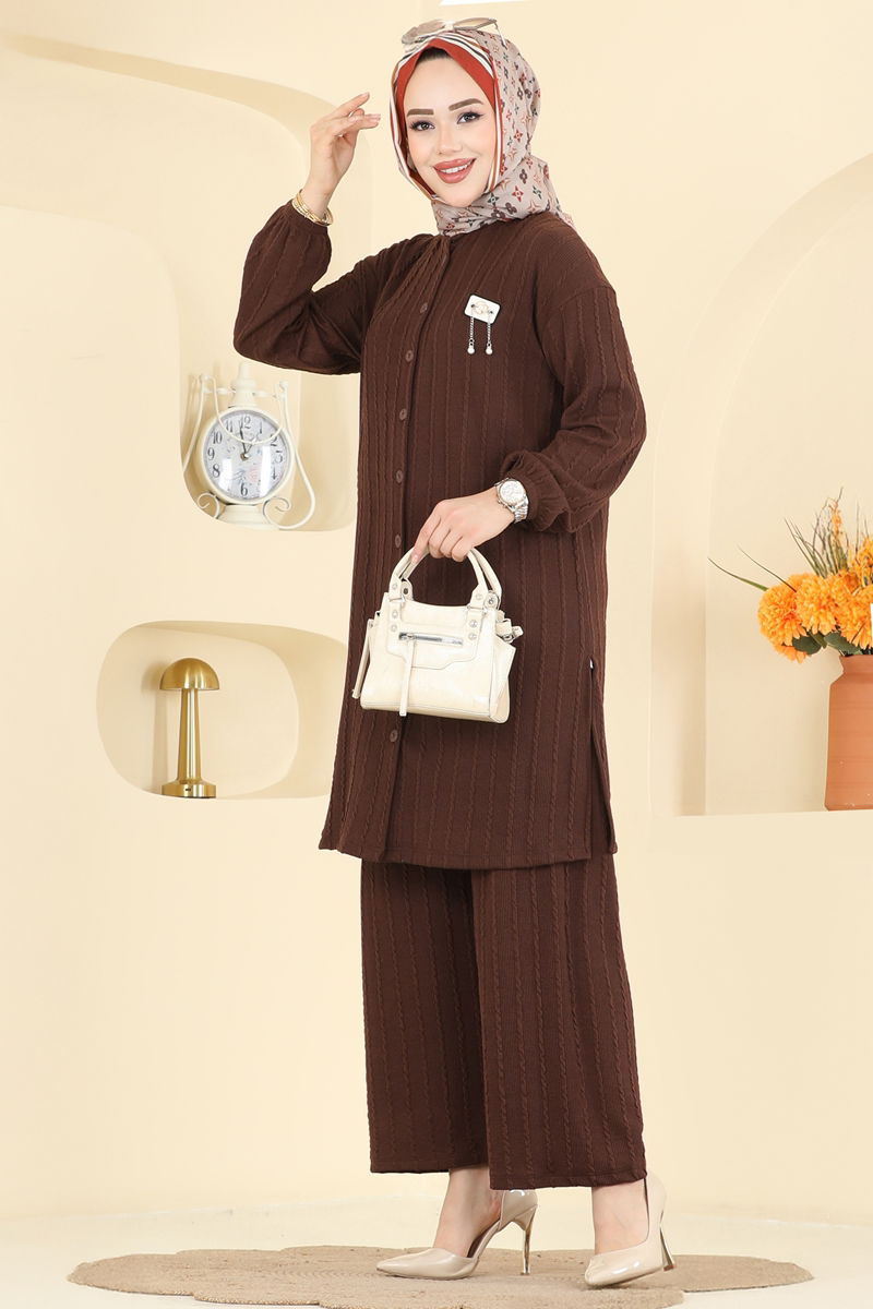 The Twisted Fabric Suit with Patch Details, ideal for those who prefer modest clothing, can be comfortably used in all four seasons. Made from twisted fabric, this suit can be washed at 30 degrees on a gentle cycle for ease of care. Featuring a crew neck and front button design, it offers a modern look. The side slit in the tunic provides freedom of movement, while the elasticated waist and cuffs on the trousers ensure ease of wear. The stitched patch details complete the stylish appearance.