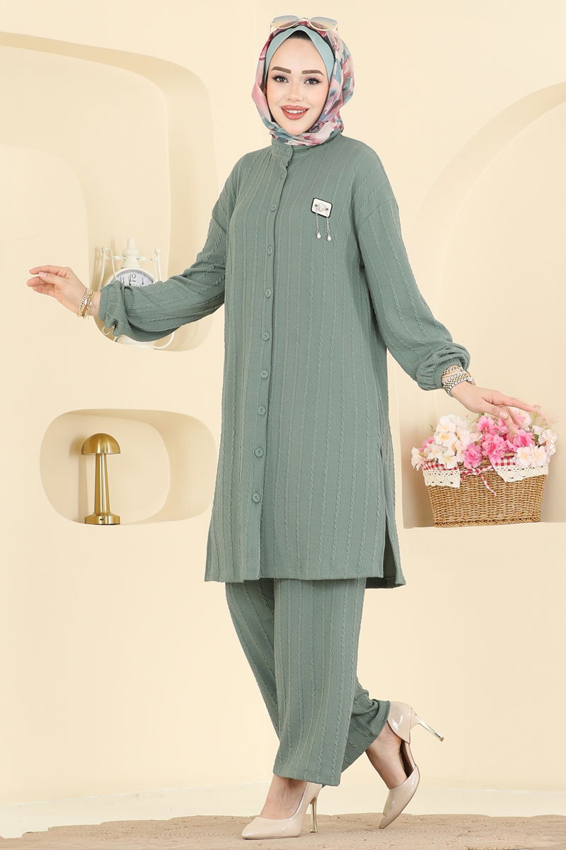 The Twisted Fabric Suit with Patch Details, ideal for those who prefer modest clothing, can be comfortably used in all four seasons. Made from twisted fabric, this suit can be washed at 30 degrees on a gentle cycle for ease of care. Featuring a crew neck and front button design, it offers a modern look. The side slit in the tunic provides freedom of movement, while the elasticated waist and cuffs on the trousers ensure ease of wear. The stitched patch details complete the stylish appearance.