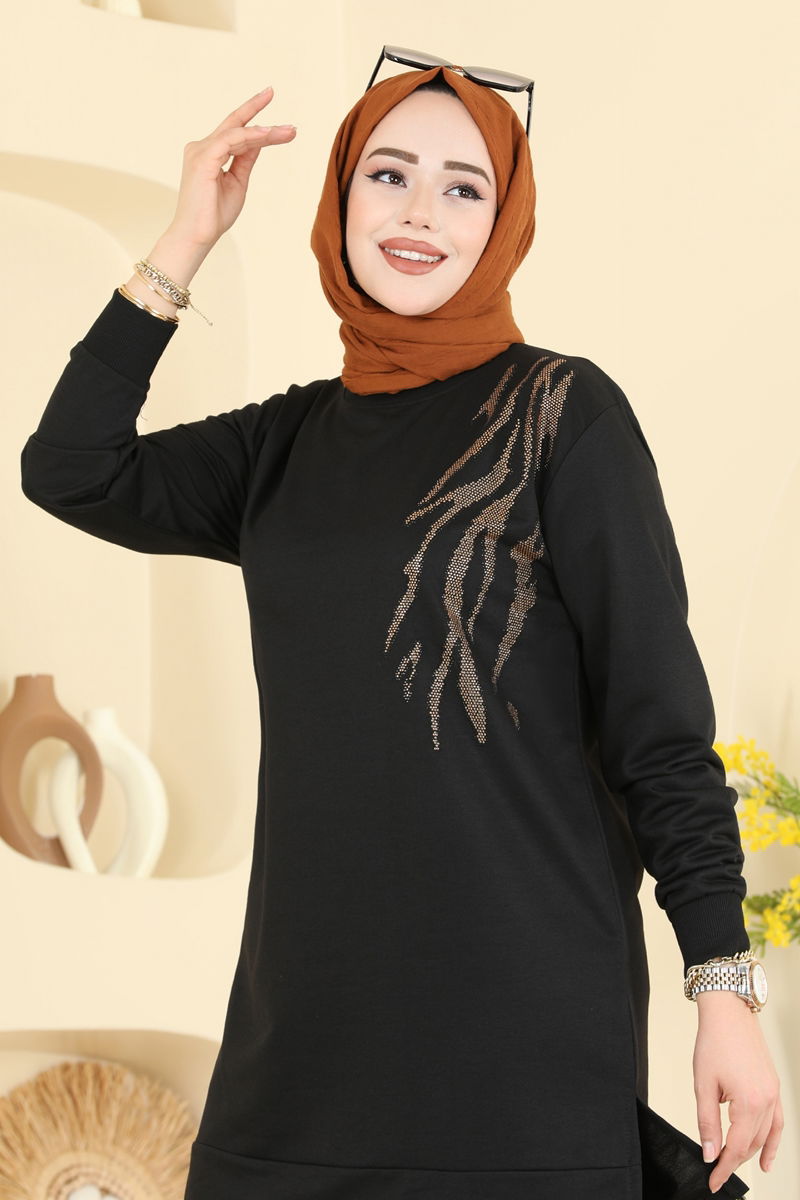 Product Feature : It is a new season hijab fashion product. The product has a Cycling collar. The tunic has a side slash.. Unlined. The stones are glued. The waist of the trousers is elastic. There may be a tonal difference in the product due to concept photo shoots.