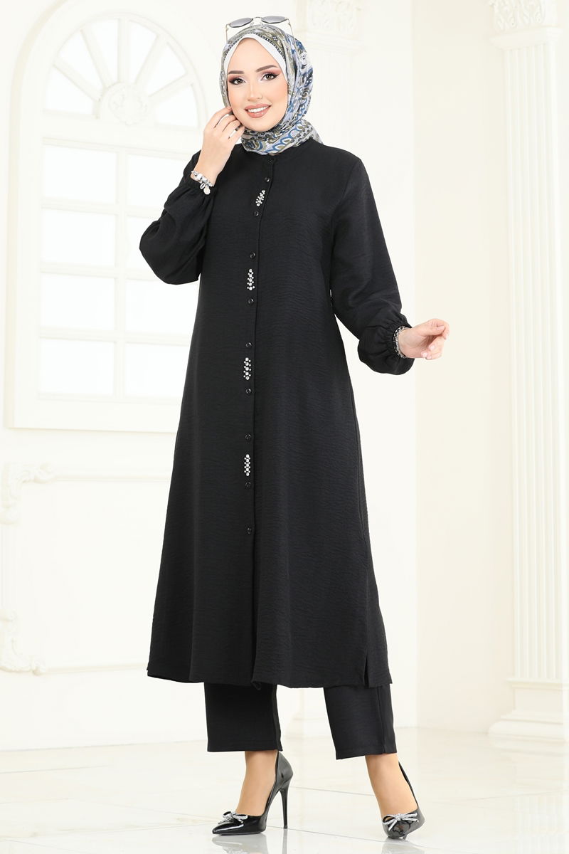 Product Feature : It is a new season hijab fashion product. The product has a Shirt collar. The product has From the front buttons. The tunic has a side slash.. Unlined. Stone details are pebble. The waist of the trousers is elastic. The cuff is rubberized. There may be a tonal difference in the product due to concept photo shoots.