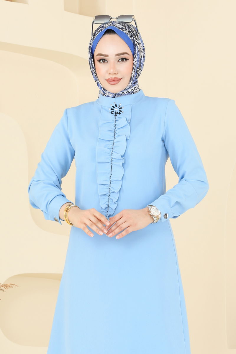 Designed for an elegant and chic look, the Stone Front Chic Suit is a modest wear that can be comfortably used in all seasons. Its delicate structure can be washed at 30 degrees, making it easy to care for. Made from high-quality Dabil fabric, this suit features a mandarin collar, unlined design, and zipper at the back that make it stand out. The active buttons on the cuffs of the tunic and trousers increase usability, while the elastic waist on the trousers ensures comfort. The stone details and stitched accents offer dazzling elegance.