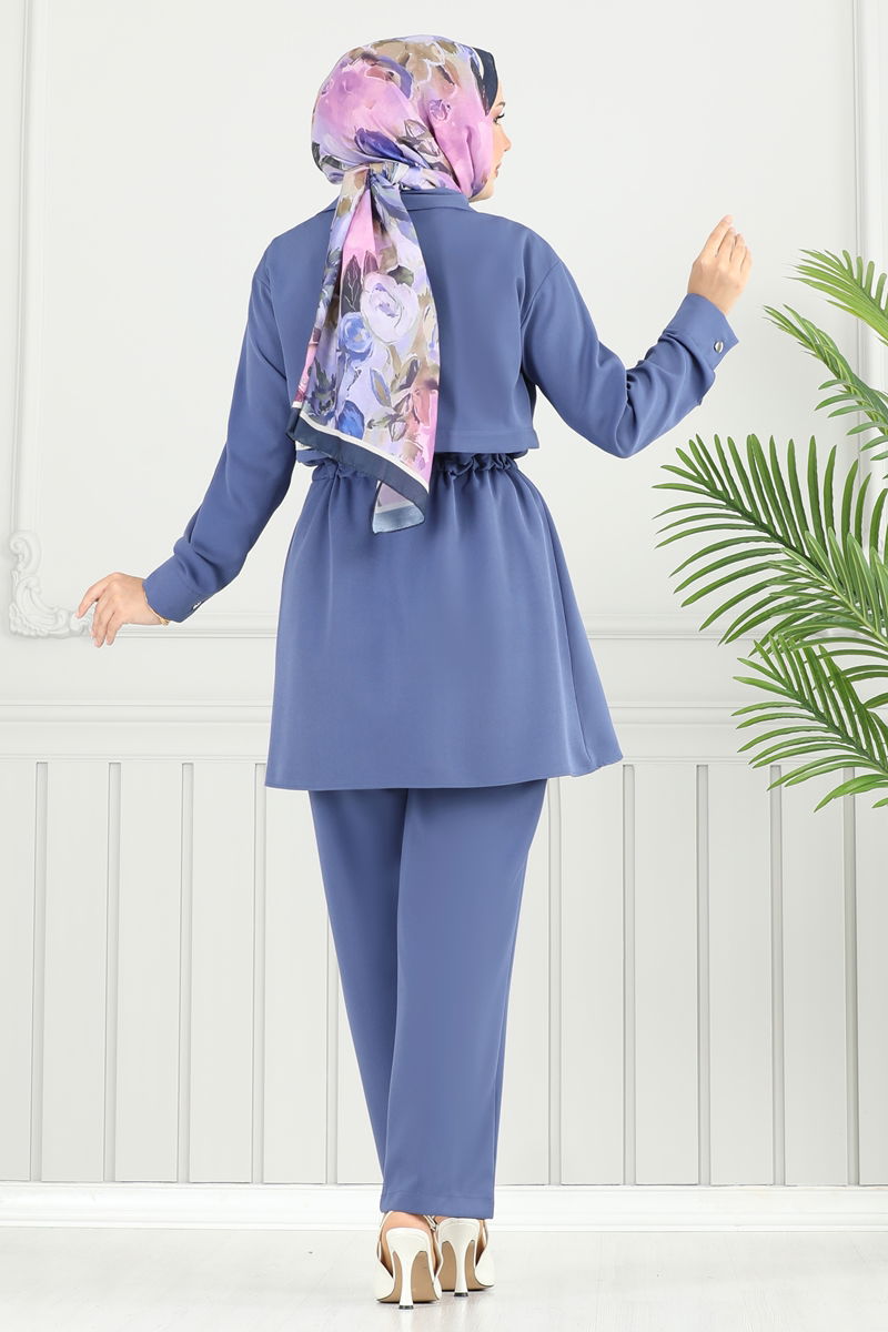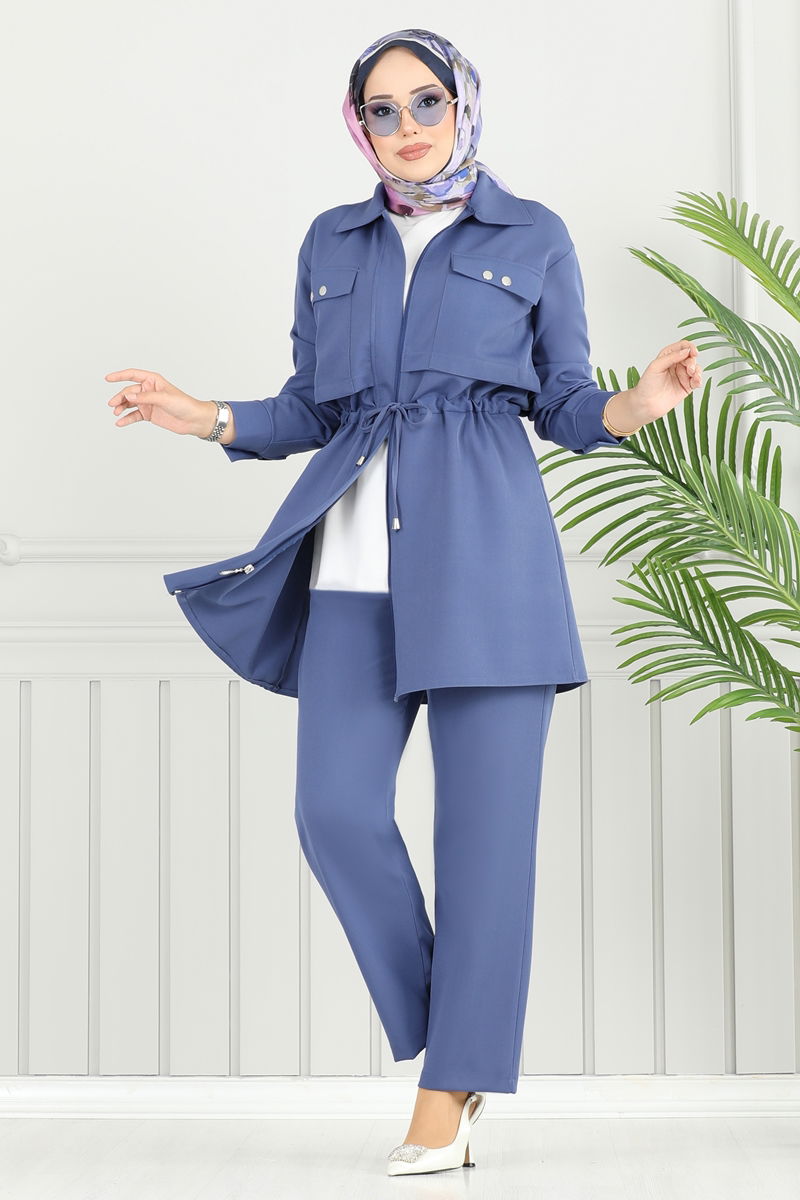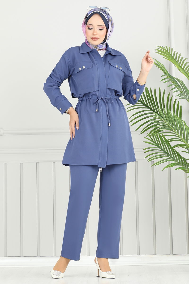 Product Feature : It is a new season hijab fashion product. It has a laced waist. The product has a Shirt collar. Unlined. The product has a zipper at the From the front part. The chest pocket is active. The waist of the trousers is elastic. There may be a tonal difference in the product due to concept photo shoots.