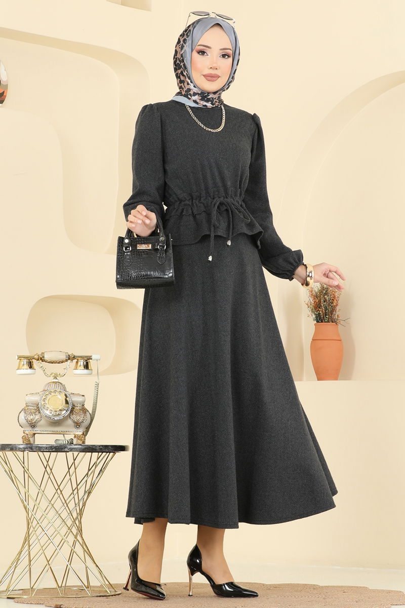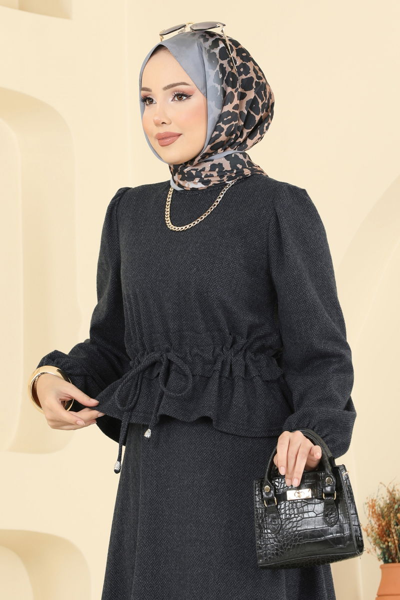 Perfect for the Autumn and Winter seasons, this Elastic Cuffed Herringbone Suit is an ideal choice for veiled women. Recommended to be washed gently at 30 degrees to maintain its shape for a long time, this outfit features a bicycle neck and an unlined design for a modern look, while the drawstring waist skirt combined with a zippered waist offers both comfort and elegance.