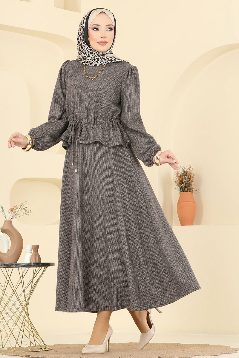 Perfect for the Autumn and Winter seasons, this Elastic Cuffed Herringbone Suit is an ideal choice for veiled women. Recommended to be washed gently at 30 degrees to maintain its shape for a long time, this outfit features a bicycle neck and an unlined design for a modern look, while the drawstring waist skirt combined with a zippered waist offers both comfort and elegance.